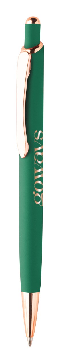 Pix din aluminiu reciclat, cu finisaj cauciucat și detalii auriu roz. Cu acoperire specială pentru gravarea laser în oglindă în culoarea aur roz. Cu mină albastră.