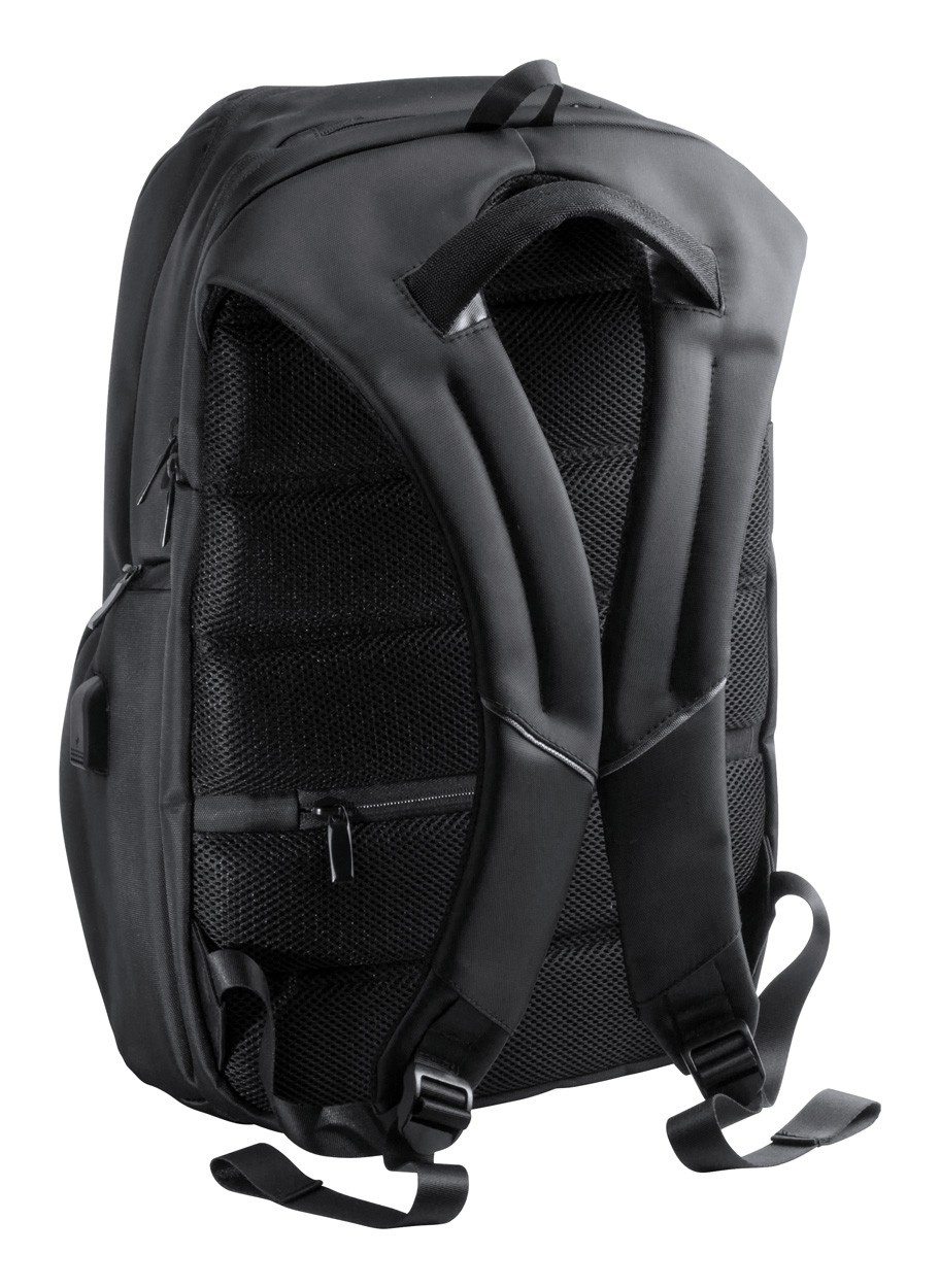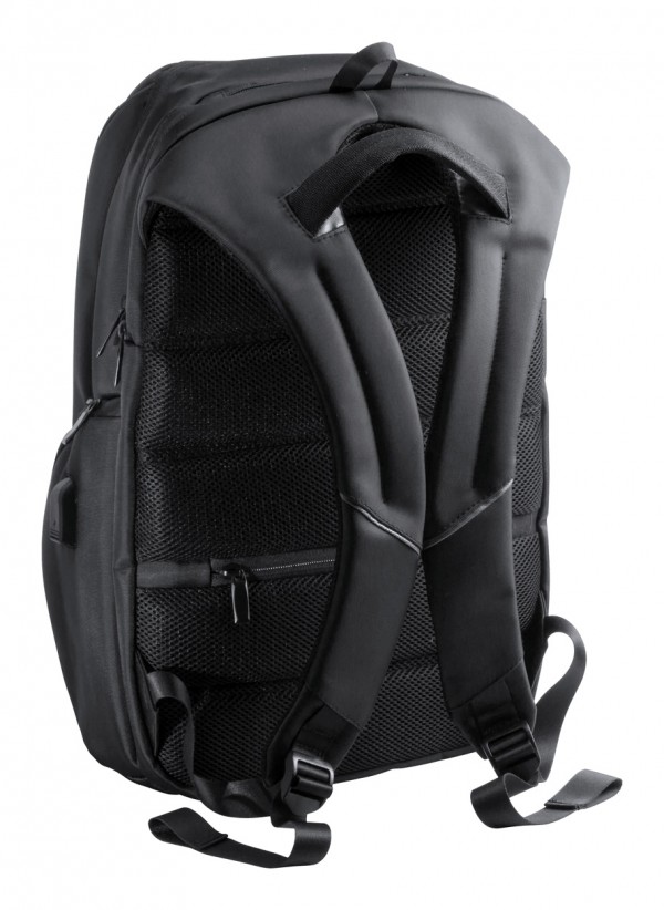 Rucsac impermeabil din nailon, cu mai multe compartimente cu fermoar, compartiment pentru laptop (15"), spate și bretele căptușite. Conector USB pentru baterie externă încorporat.