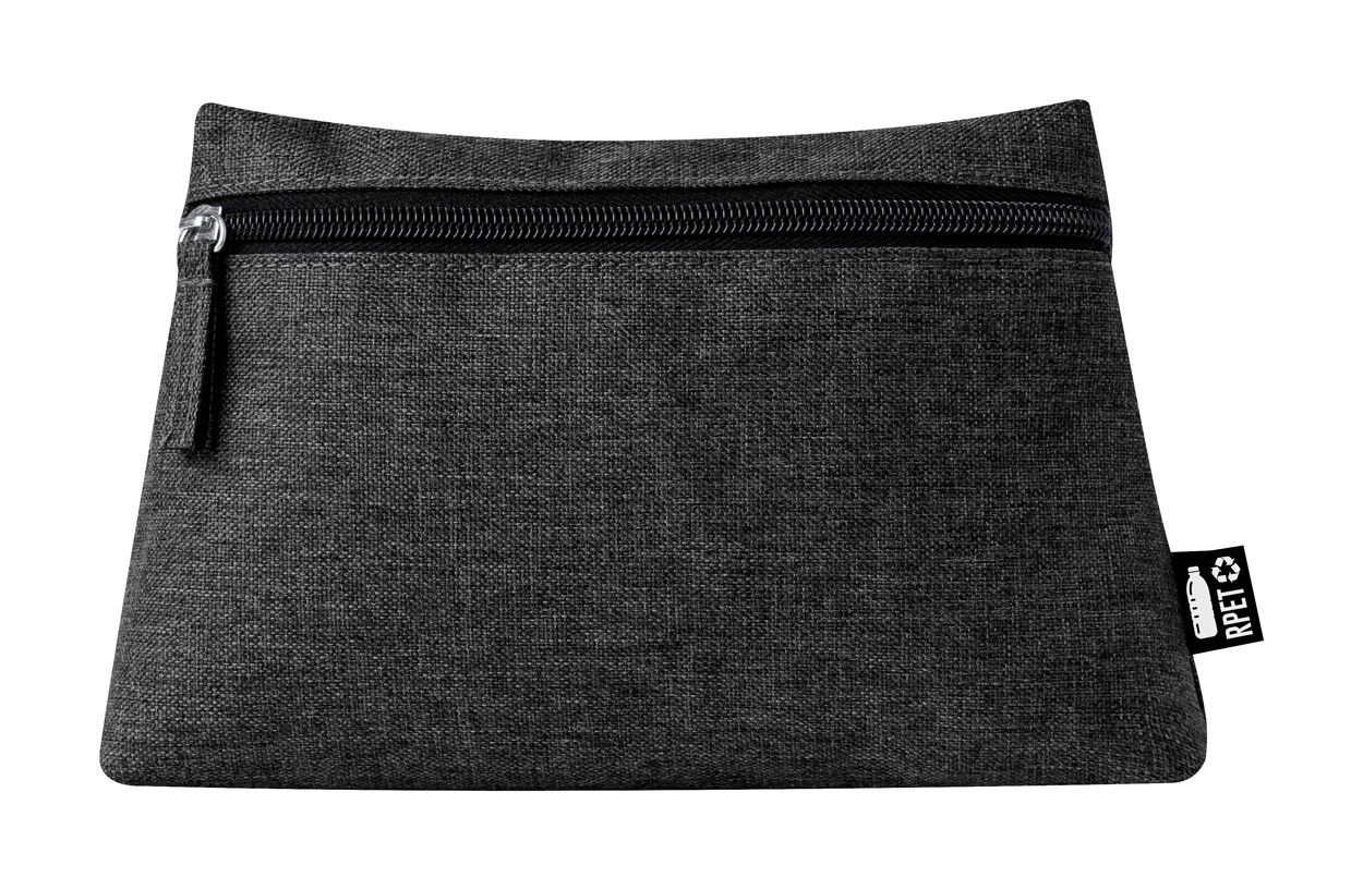 Geantă cosmetică RPET, cu fermoar. Poliester 600D RPET, cu etichetă RPET distinctă.
