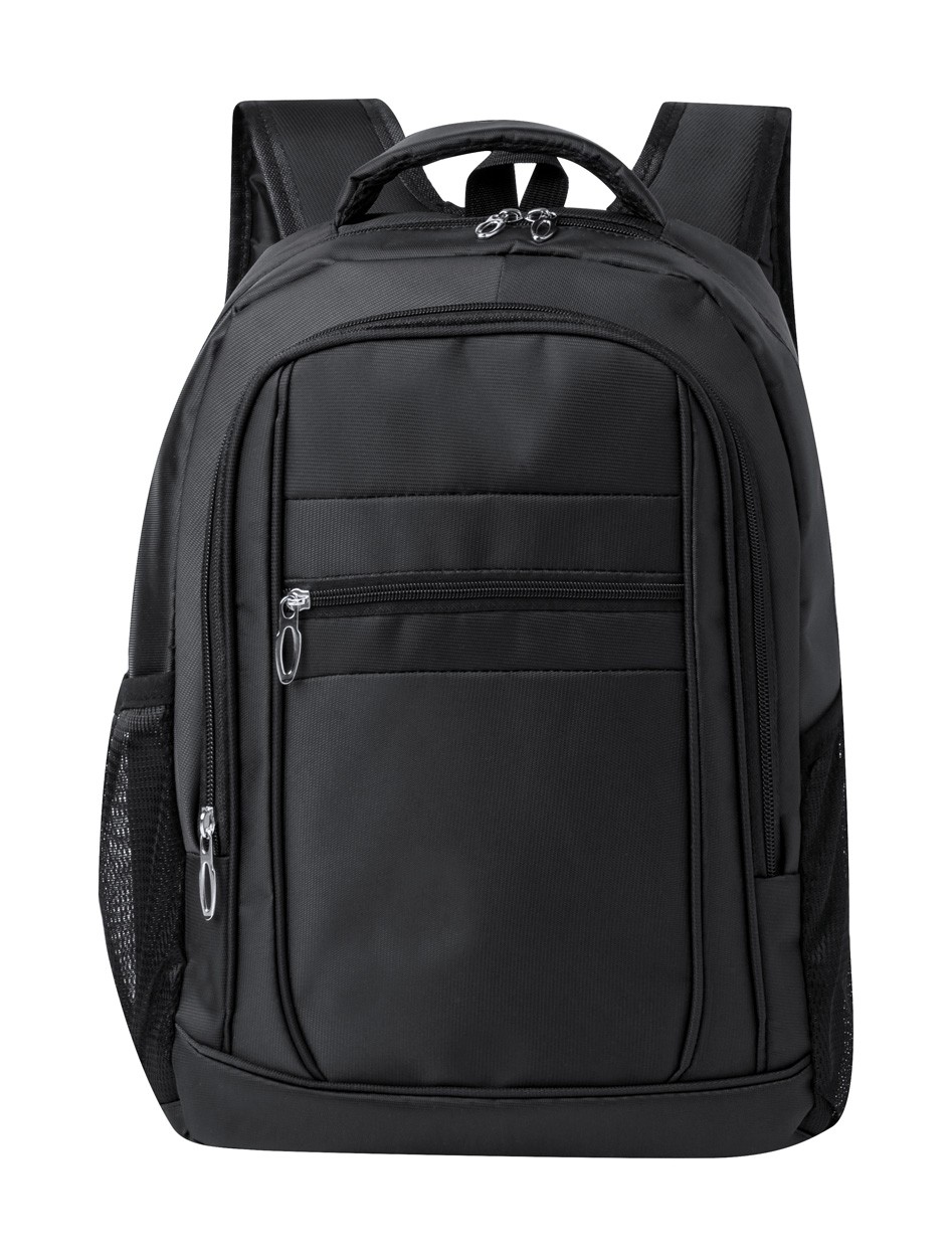 Rucsac din nailon, cu compartimente cu fermoar, buzunare laterale, compartiment căptușit pentru laptop (15") și tabletă (10"), spate și bretele căptușite. Nailon 600D.