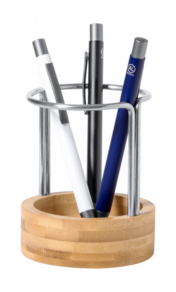 Suport de birou pentru pixuri, din bambus și oțel inoxidabil.