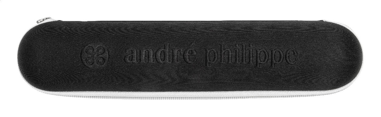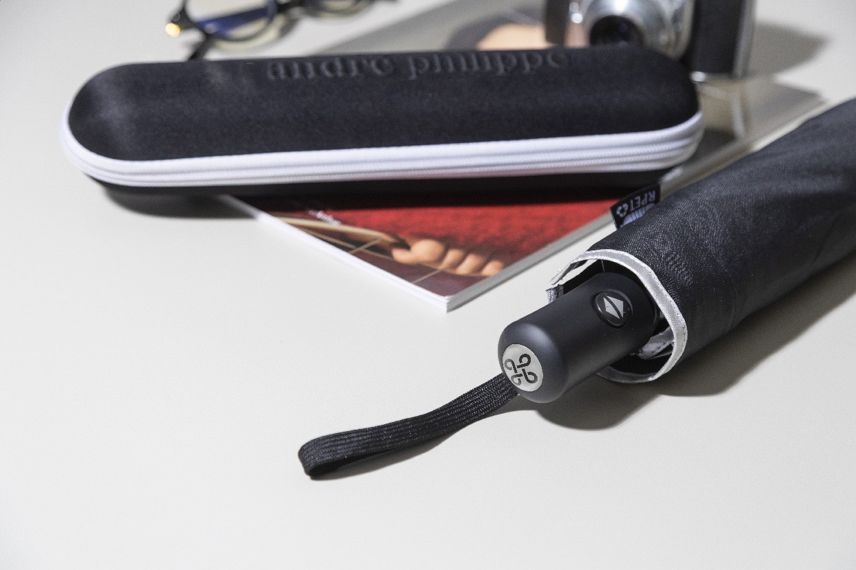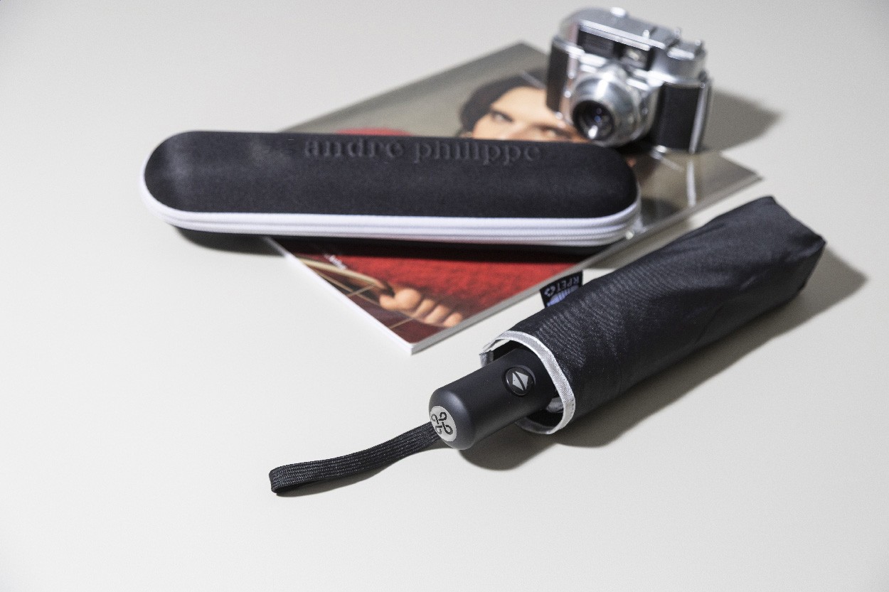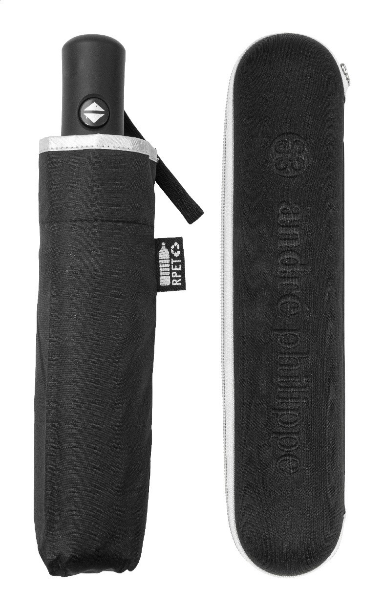 Umbrelă pliabilă, complet automată (deschidere/închidere), rezistentă la vânt, cu 8 panouri, finisaj argintiu. Cu ramă metalică, nervuri din fibră de sticlă, mâner cauciucat cu curea de mână și husă de transport. Material pongee 190T RPET. Cu etichetă distinctivă RPET. În husă rigidă cu fermoar, cu sigla inscripționată. Produs marca André Philippe.