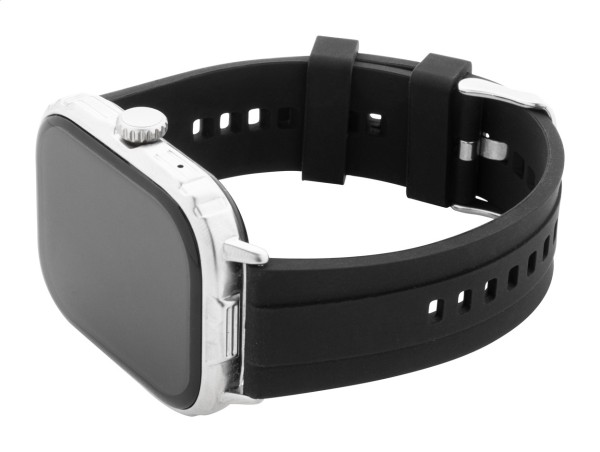 Ceas inteligent wireless multifuncțional în carcasă metalică cu ecran tactil TFT de 2,01", baterie reîncărcabilă de 210 mAh și curea din silicon. Are mai multe funcții inteligente și de monitorizare a sănătății, cum ar fi ritmul cardiac, tensiunea arterială și monitorul de oxigen, pe lângă multe altele. Poate fi conectat la smartphone-uri cu o aplicație gratuită disponibilă pentru iOS și Android. Include cablu magnetic de încărcare USB. Rezistent la apă IP65.