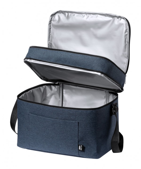 Geantă frigorifică, din poliester 600D RPET, cu căptușeală PEVA, cu 2 compartimente cu fermoar și curea de umăr reglabilă. Cu etichetă distinctivă RPET.