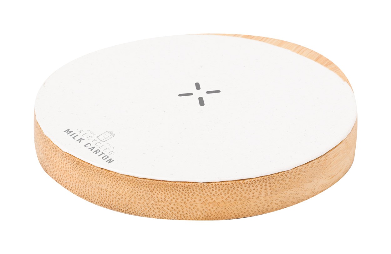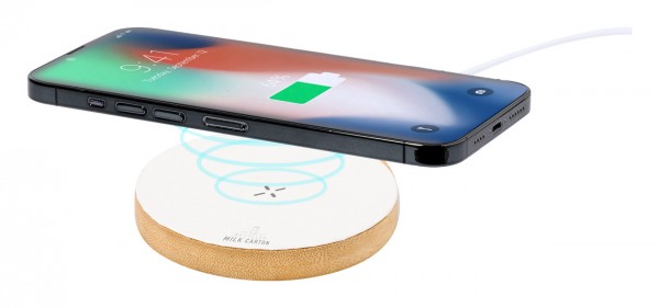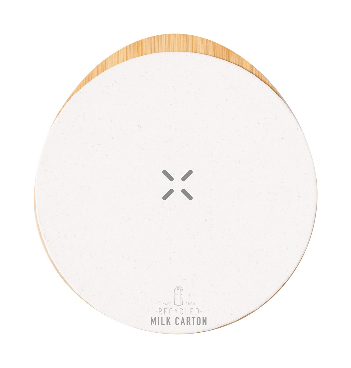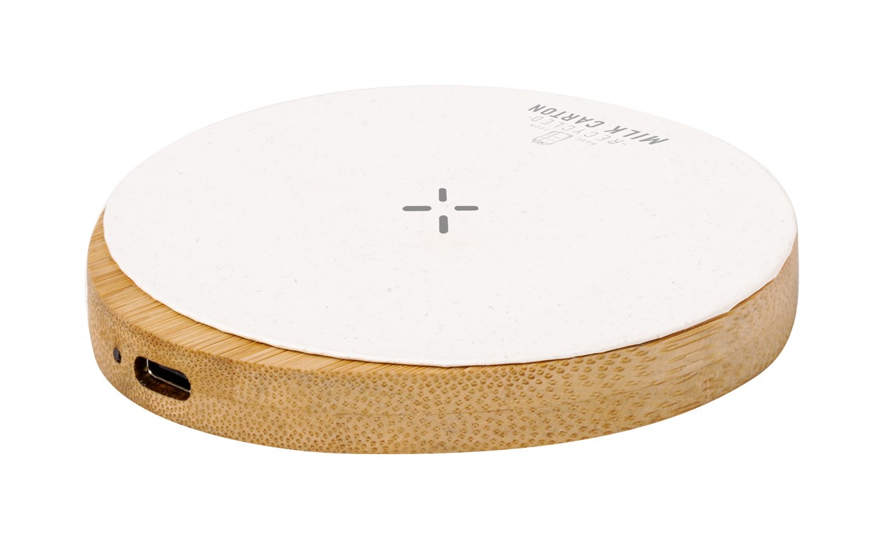 Wireless fast charger (15W) in recycled milk carton and bamboo. Including USB charger cable.