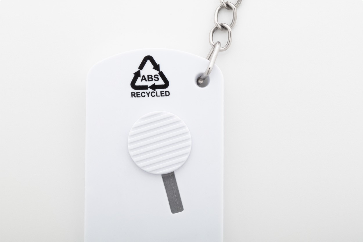 Cuțit de hârtie, din plastic ABS reciclat și oțel inoxidabil, cu lamă auto-retractabilă și breloc metalic.