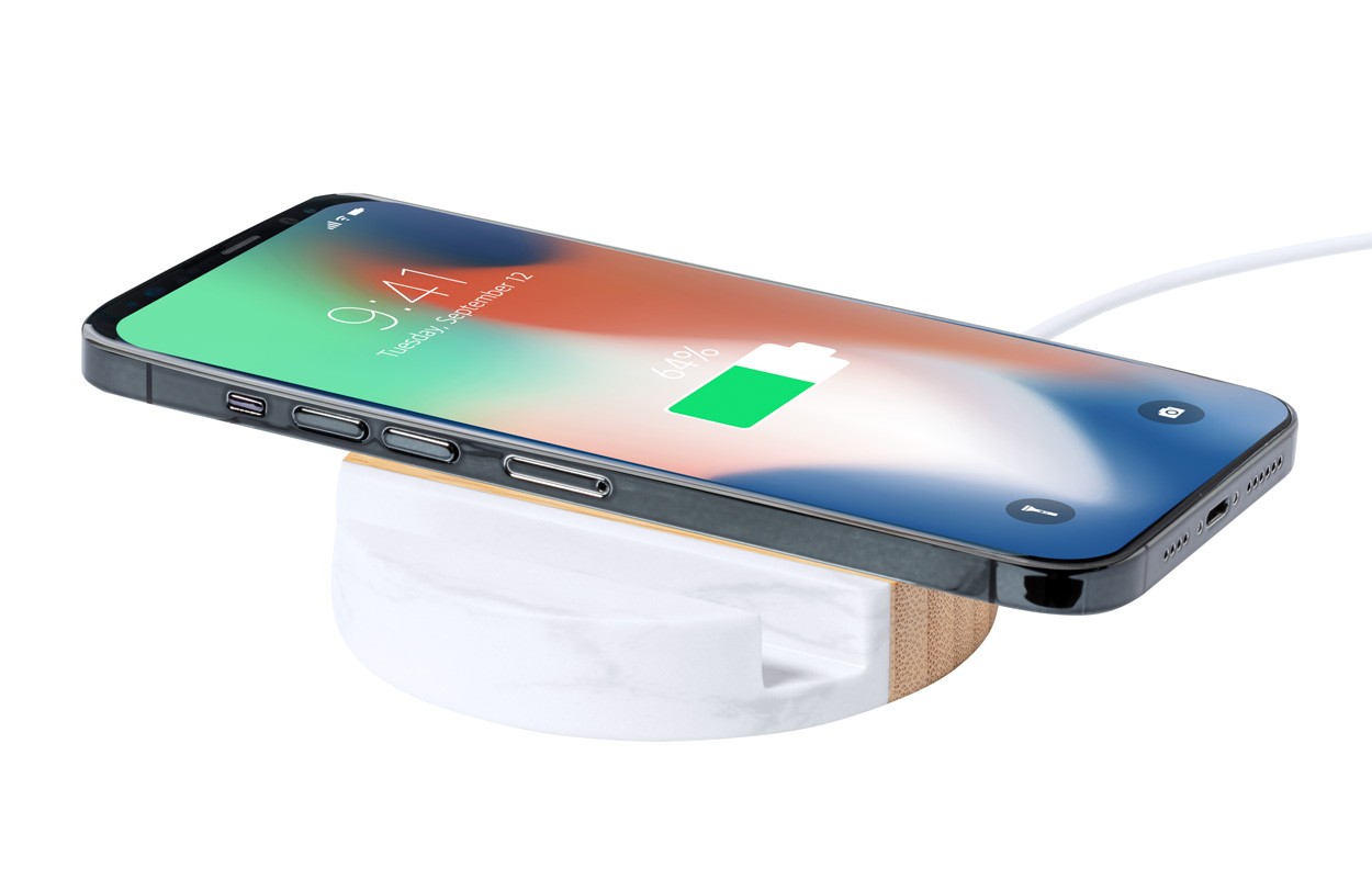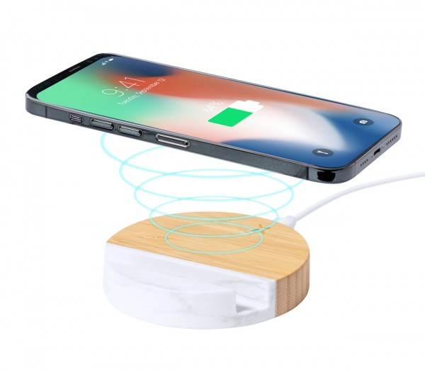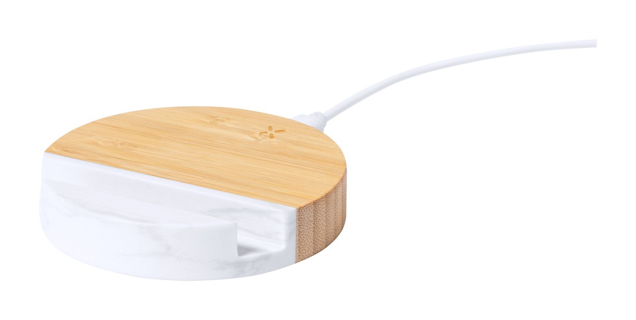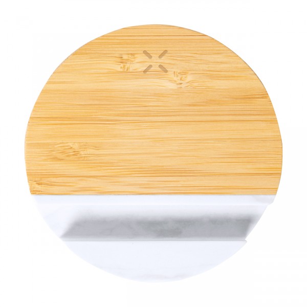 Încărcător rapid fără fir, din bambus (15W), cu suport pentru telefon mobil cu extract de marmură. Inclusiv cablu de încărcare USB.