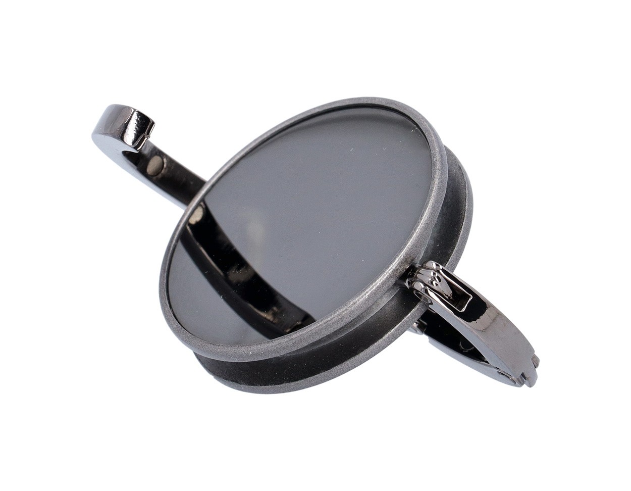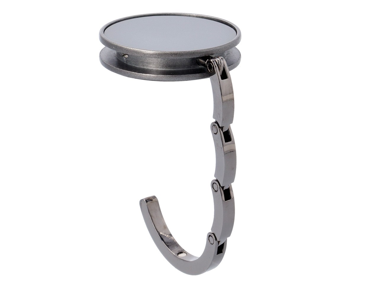 Cârlig metalic pentru geantă, finisaj metalic și suprafaţă strălucitoare.