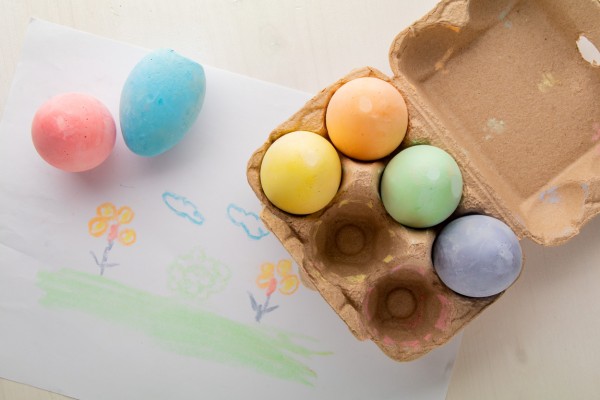 Set de 6 ouă din cretă colorată, intr-o cutie de carton pentru ouă.