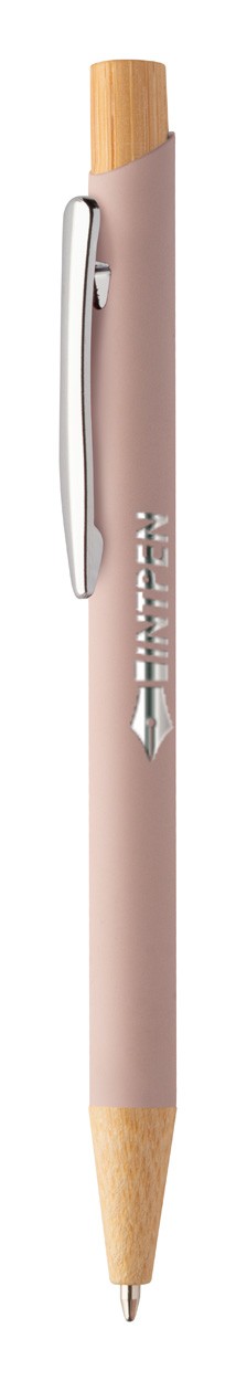Pix din aluminiu reciclat, cu părți din bambus, finisaj cauciucat și clemă cromată. Cu acoperire specială pentru gravarea laser în oglindă. Cu mină albastră