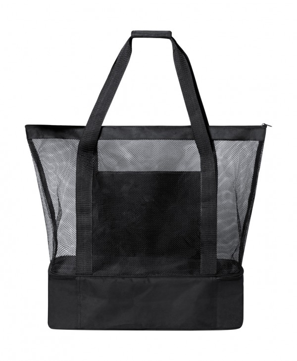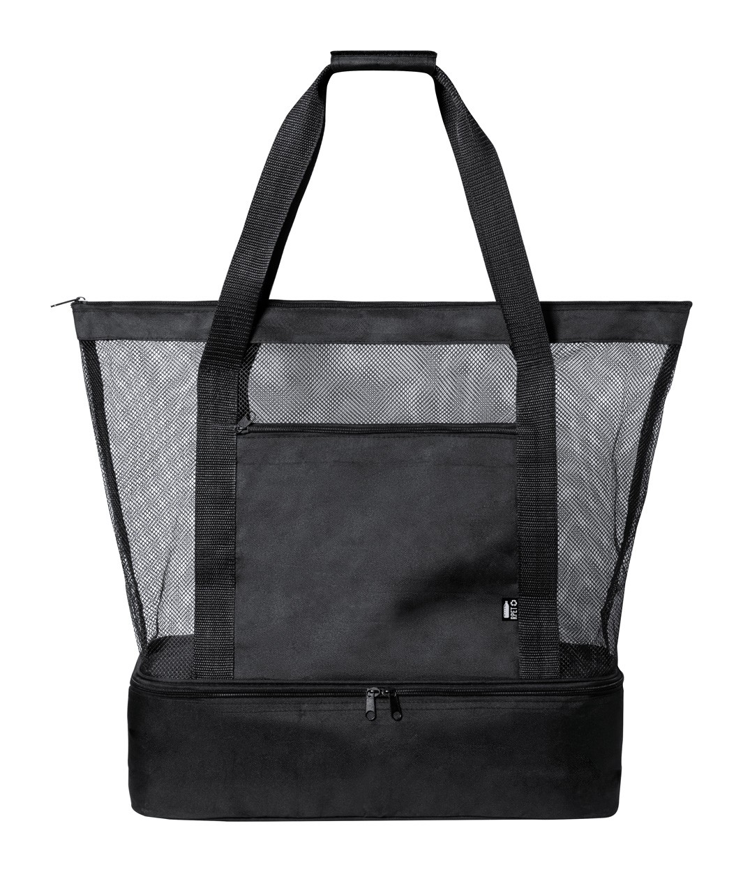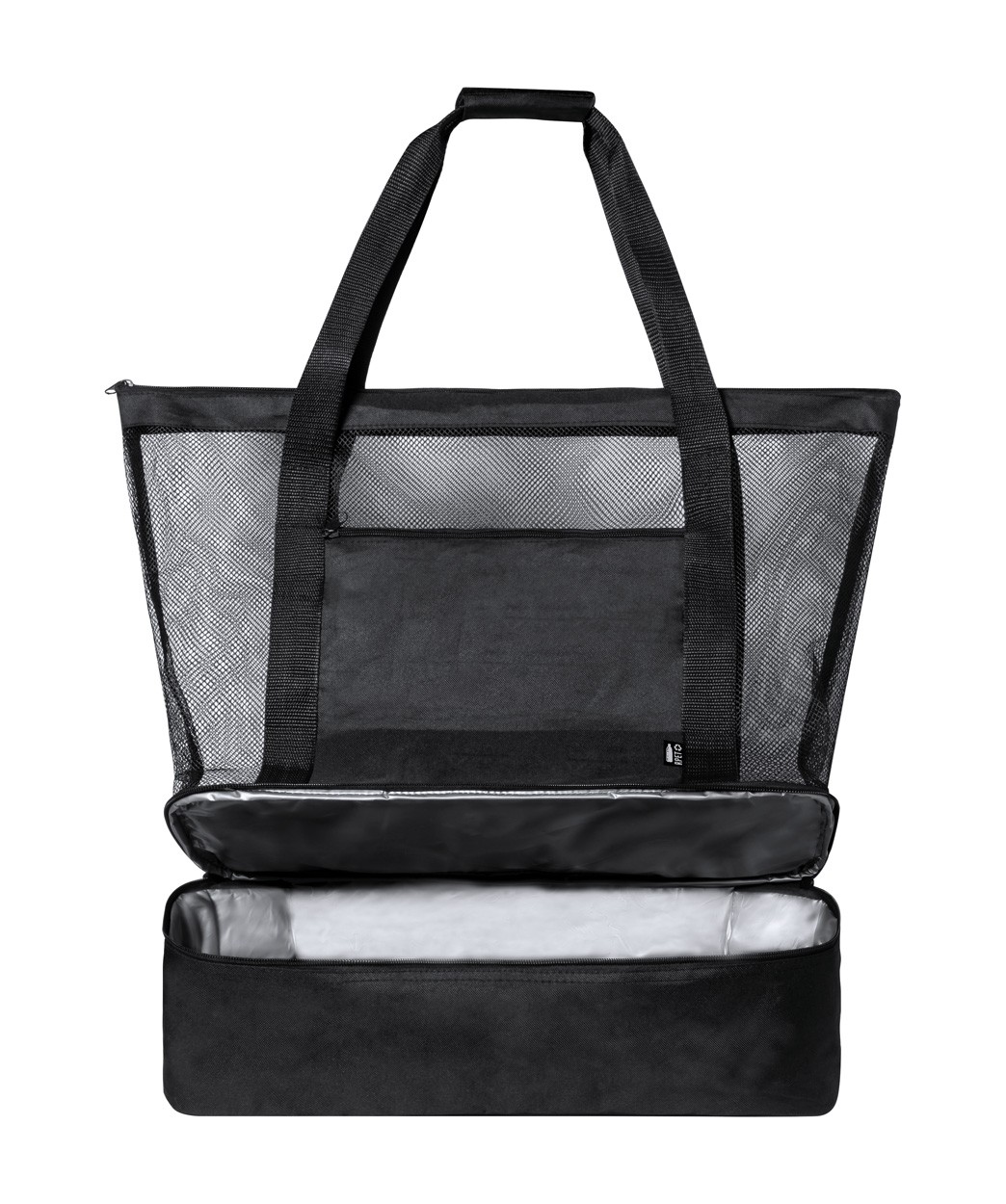 Geantă de cumpărături RPET cu compartiment principal din plasă, buzunar frontal mare și compartiment frigorific cu fermoar și căptușeală PEVA. Cu mânere întărite și etichetă distinctivă RPET. Poliester 600D RPET.