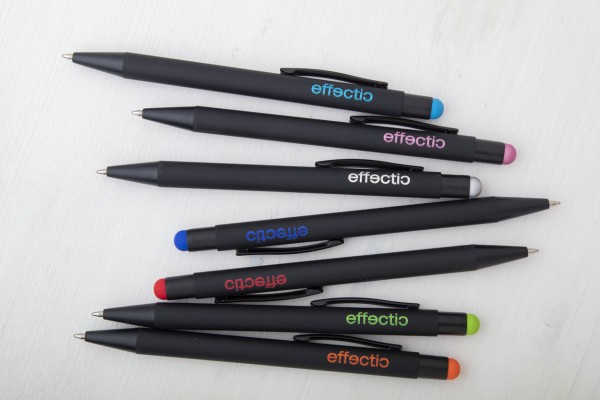 Pix din aluminiu cu touch, corp cauciucat. Cu finisaj special pentru gravură oglindă colorată. Mină albastră.