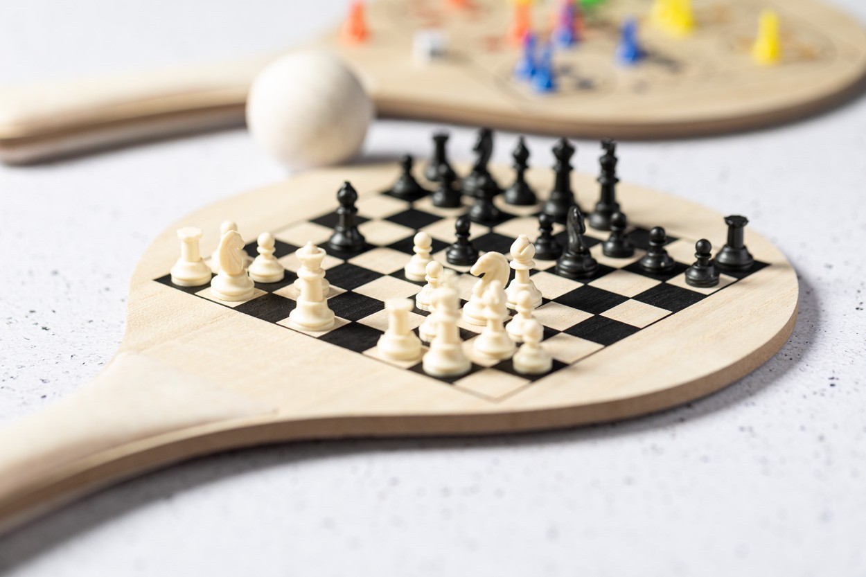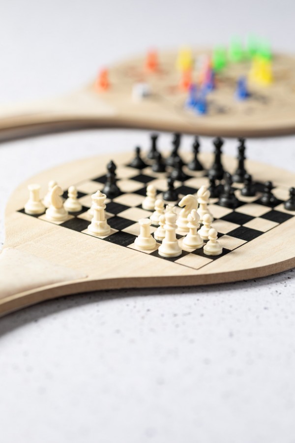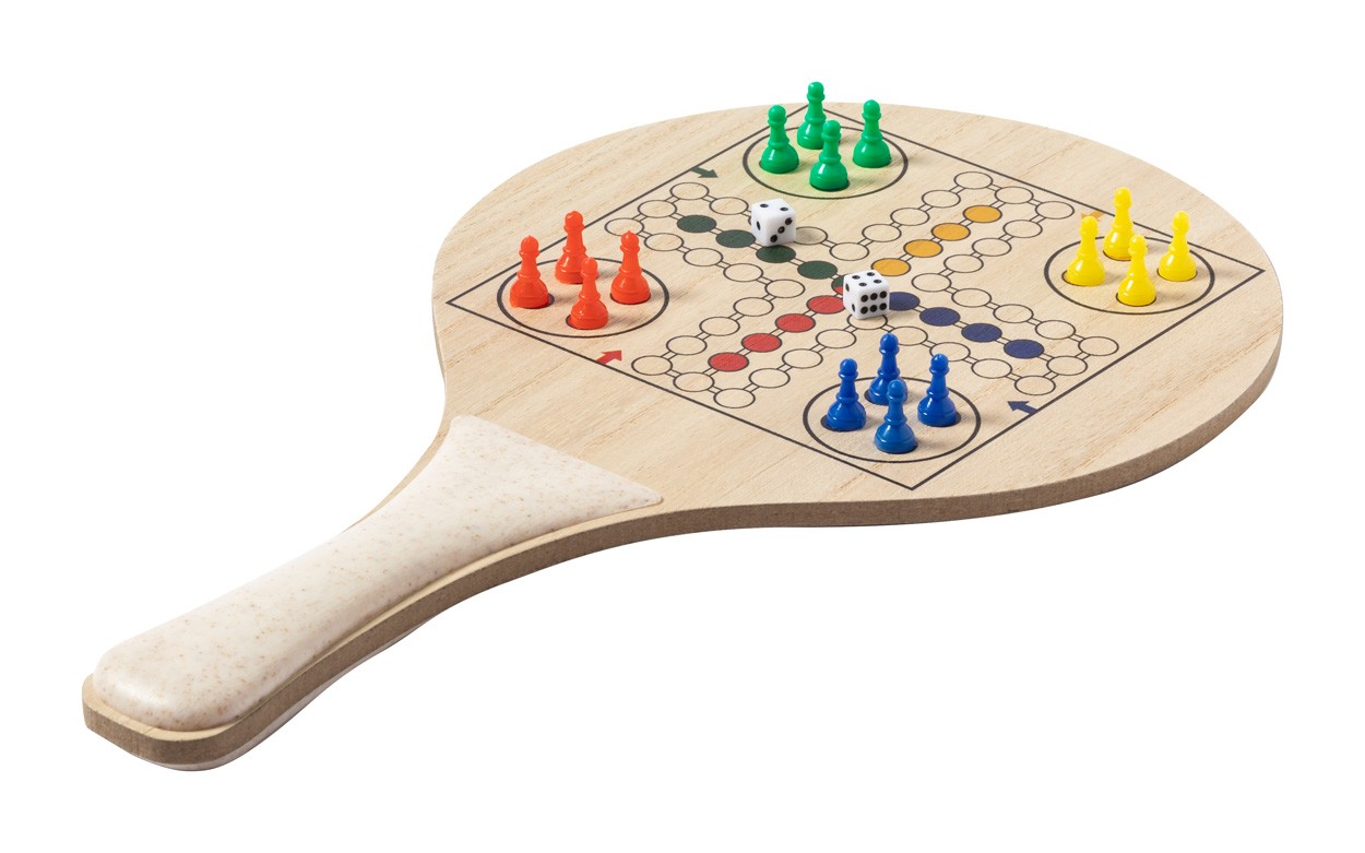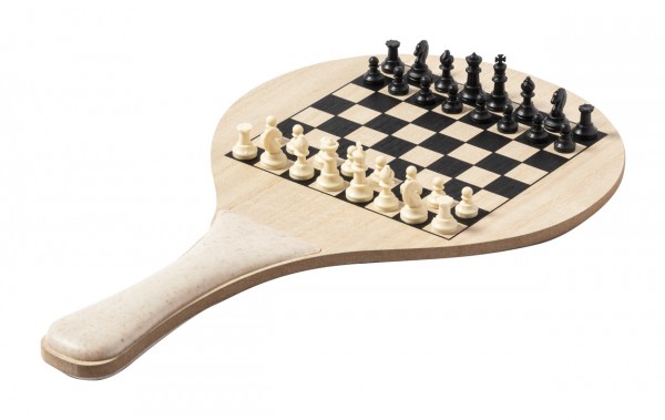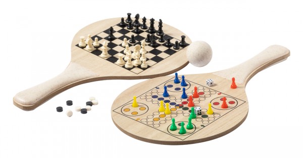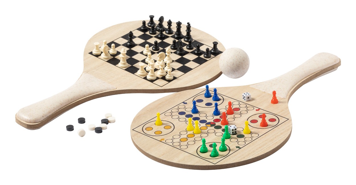Set tenis de plajă, cu 2 rachete și o minge, din lemn și plastic ecologic din paie de grâu. Inclusiv 3 jocuri de societate, care pot fi jucate pe rachete. În husă din bumbac cu șnur.