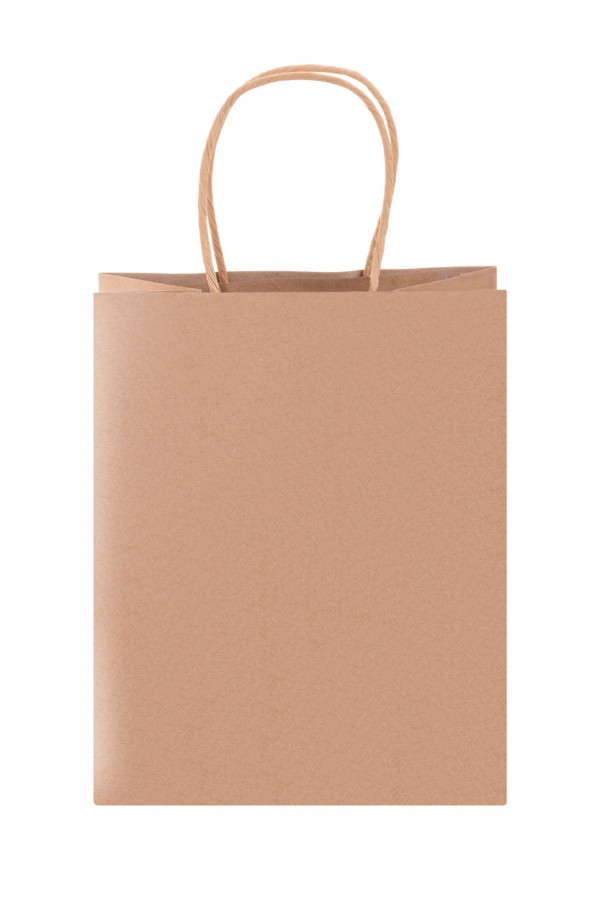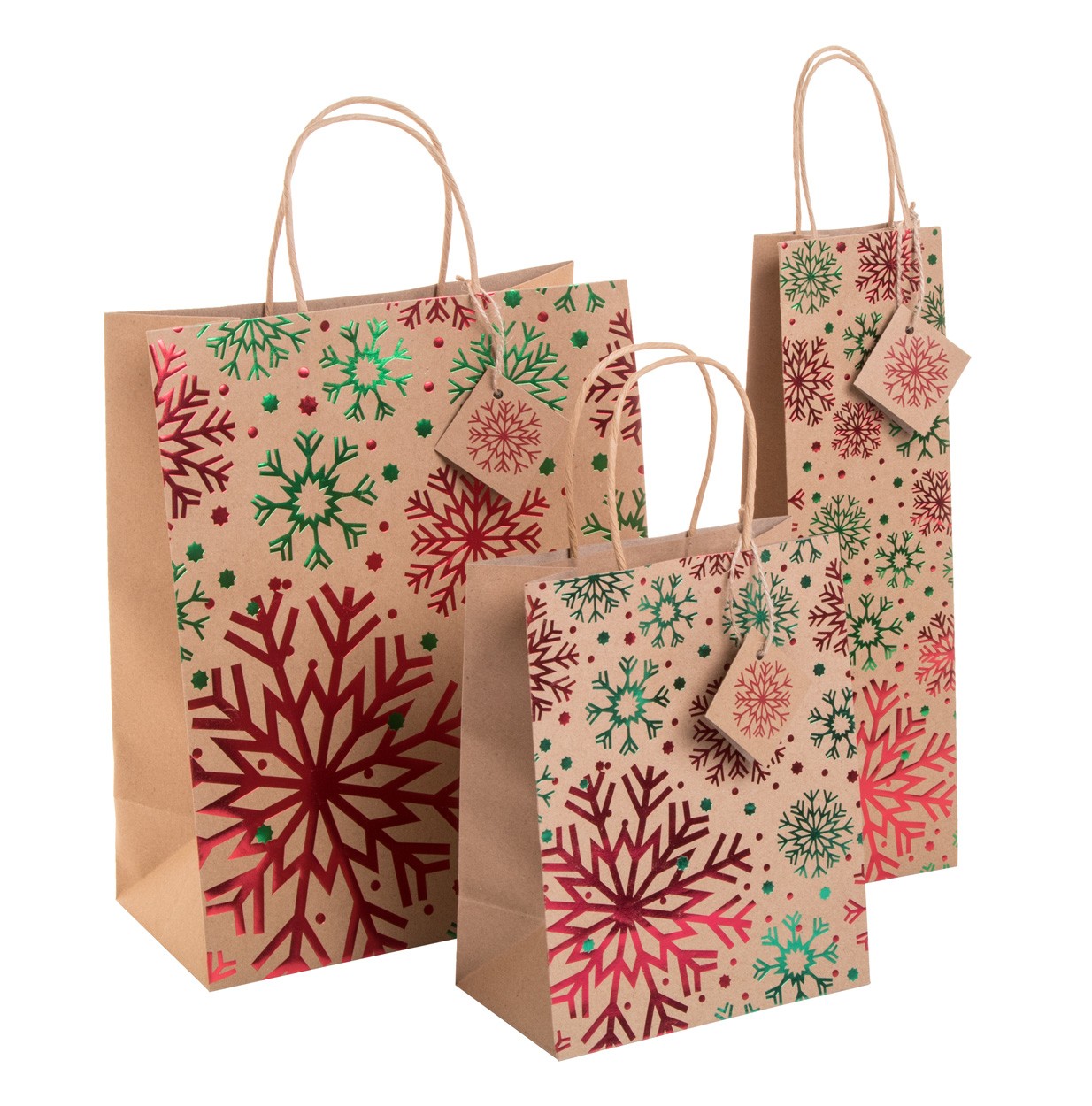 Pungă cadou, din hârtie kraft reciclată, cu design de Crăciun ștanțat cu folie, mânere răsucite și etichetă pentru cadou. 140 g/m².