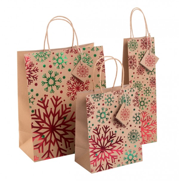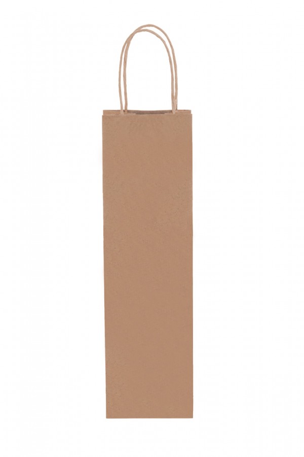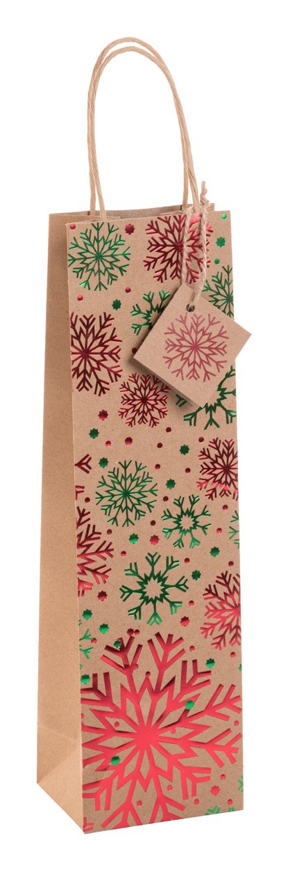 Pungă cadou, din hârtie kraft reciclată, pentru sticlă de vin, cu design de Crăciun ștampilat cu folie, mânere răsucite și etichetă pentru cadou. 140 g/m².