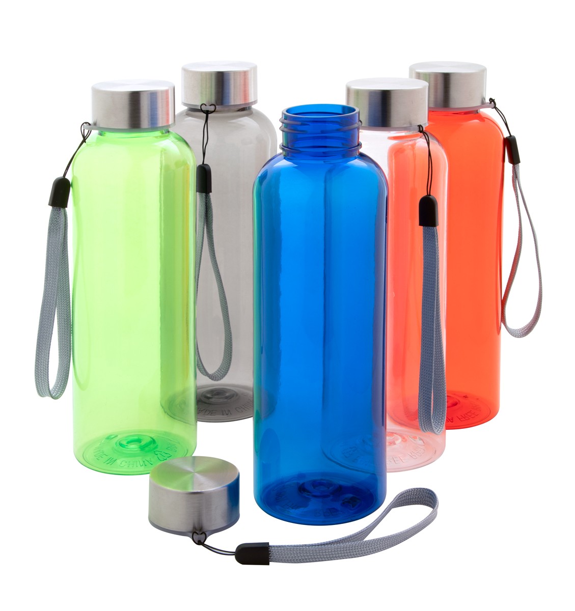 Sticlă RPET, cu capac din oțel inoxidabil și curea de transport, 500 ml. Fără BPA. Nu este potrivită pentru băuturi carbogazoase.