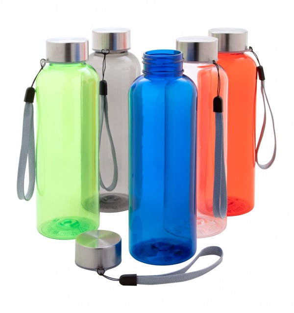 Sticlă RPET, cu capac din oțel inoxidabil și curea de transport, 500 ml. Fără BPA. Nu este potrivită pentru băuturi carbogazoase.