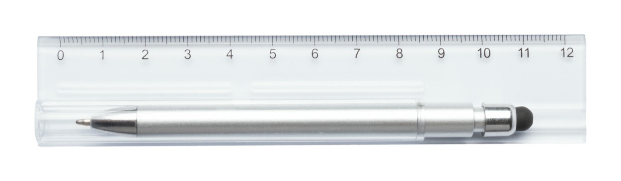 Riglă din plastic de 12 cm, cu pix pentru touch screen. Mină albastră.