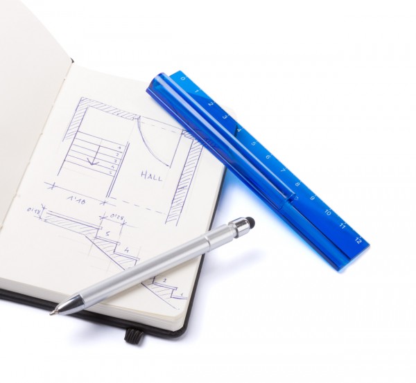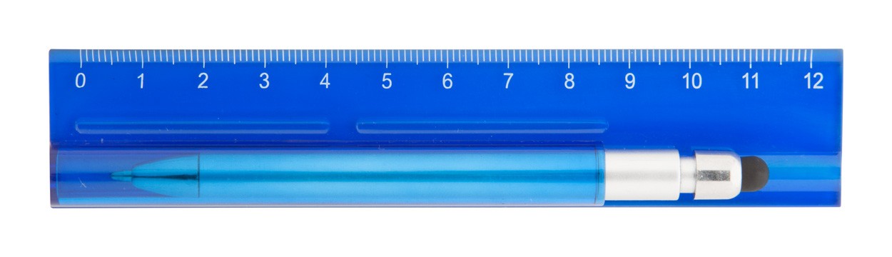Riglă din plastic de 12 cm, cu pix pentru touch screen. Mină albastră.