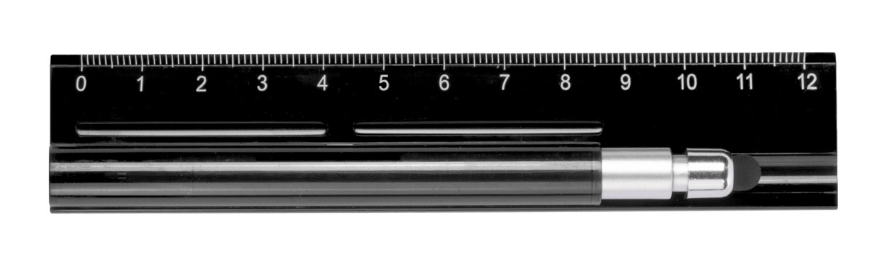 Riglă din plastic de 12 cm, cu pix pentru touch screen. Mină albastră.