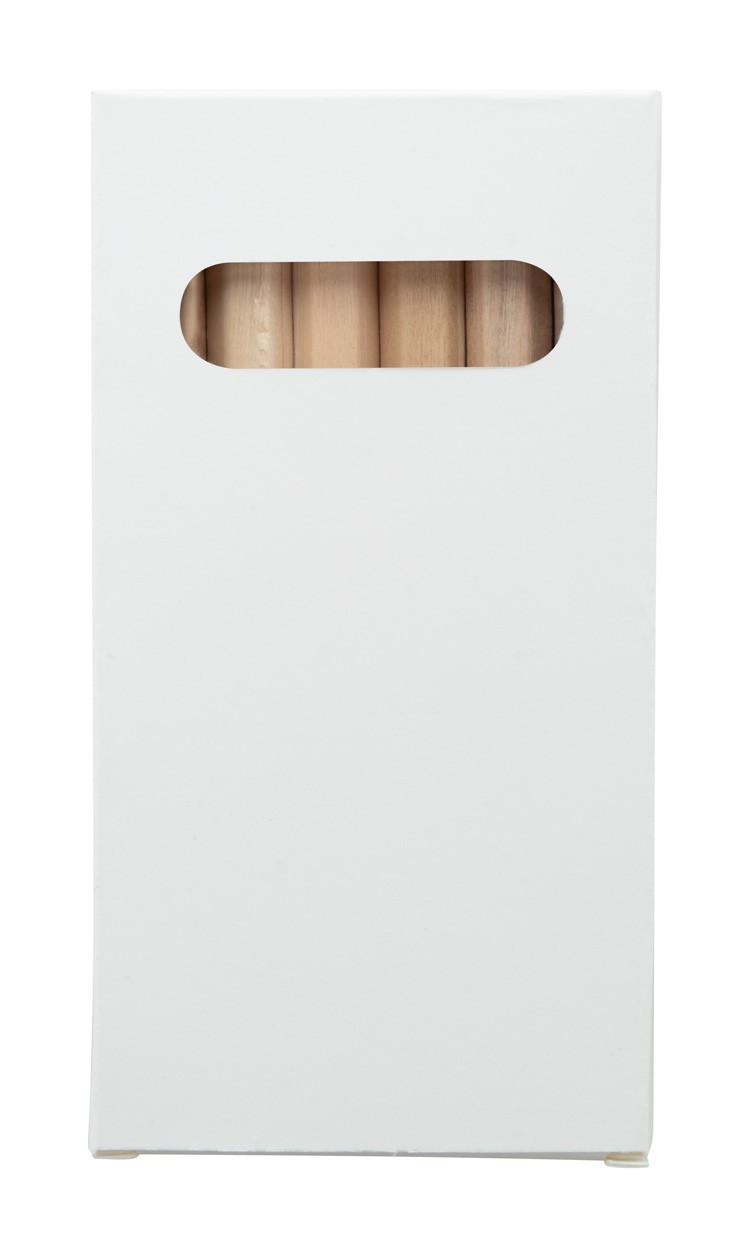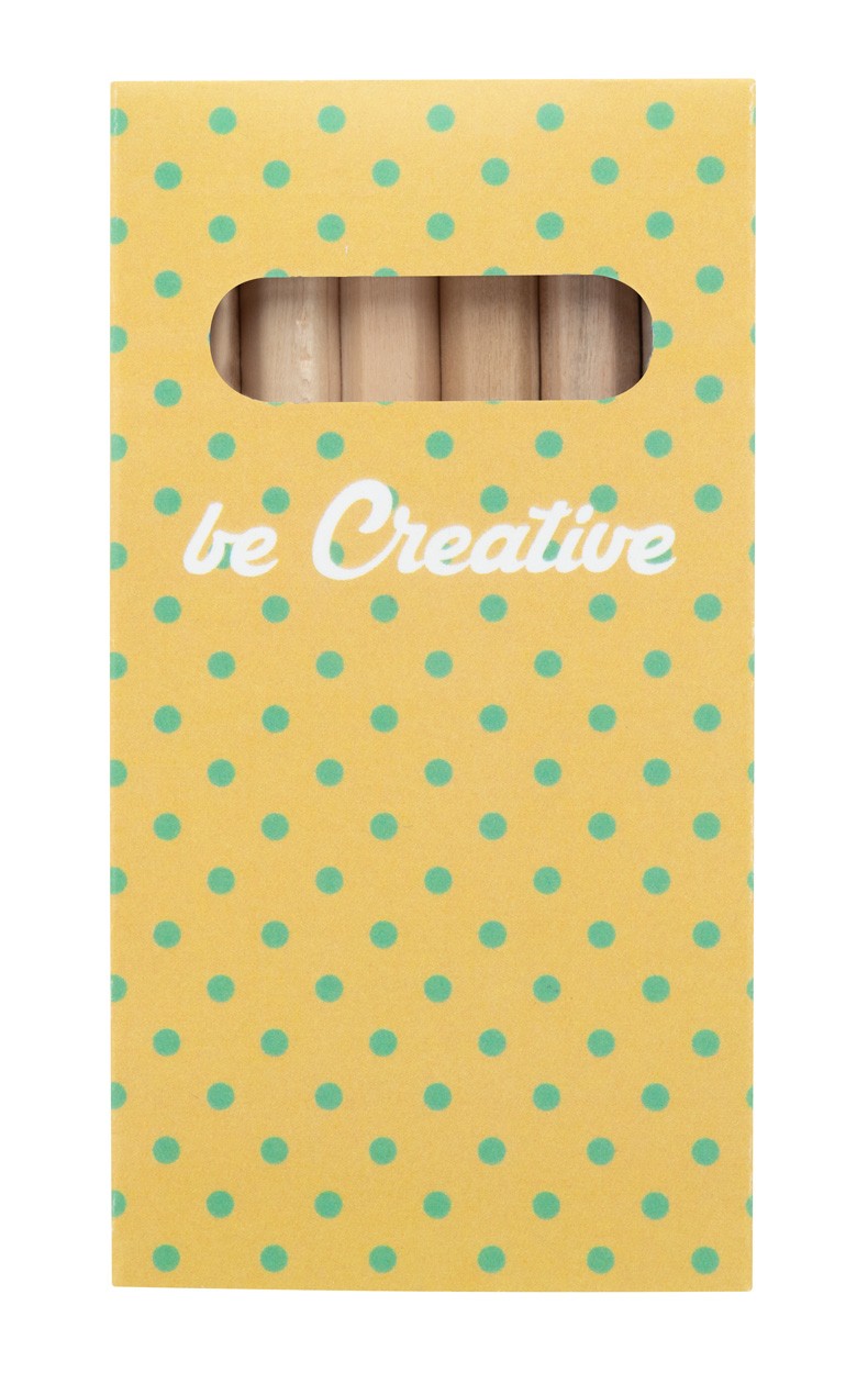6 buc creioane colorate din lemn în cutie de hârtie imprimată full colour. Prețul include imprimarea digitală. Cantitate minimă de comandă: 100 buc.