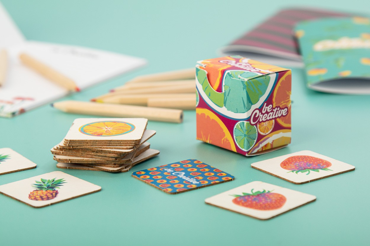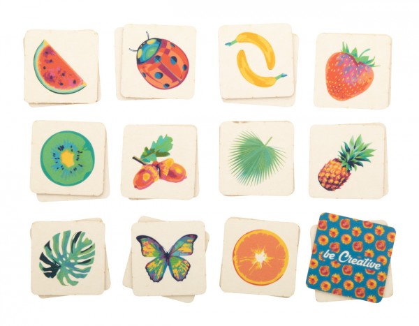 Joc de memorie, din carton, cu motive tematice, în cutie de hârtie personalizată. Cu 24 de plăci (40x40 mm). Prețul include 12 imprimări color diferite pe partea din față a plăcilor, 1 imprimare color pe spatele tuturor plăcilor și o cutie imprimată color. MOQ: 250 buc.