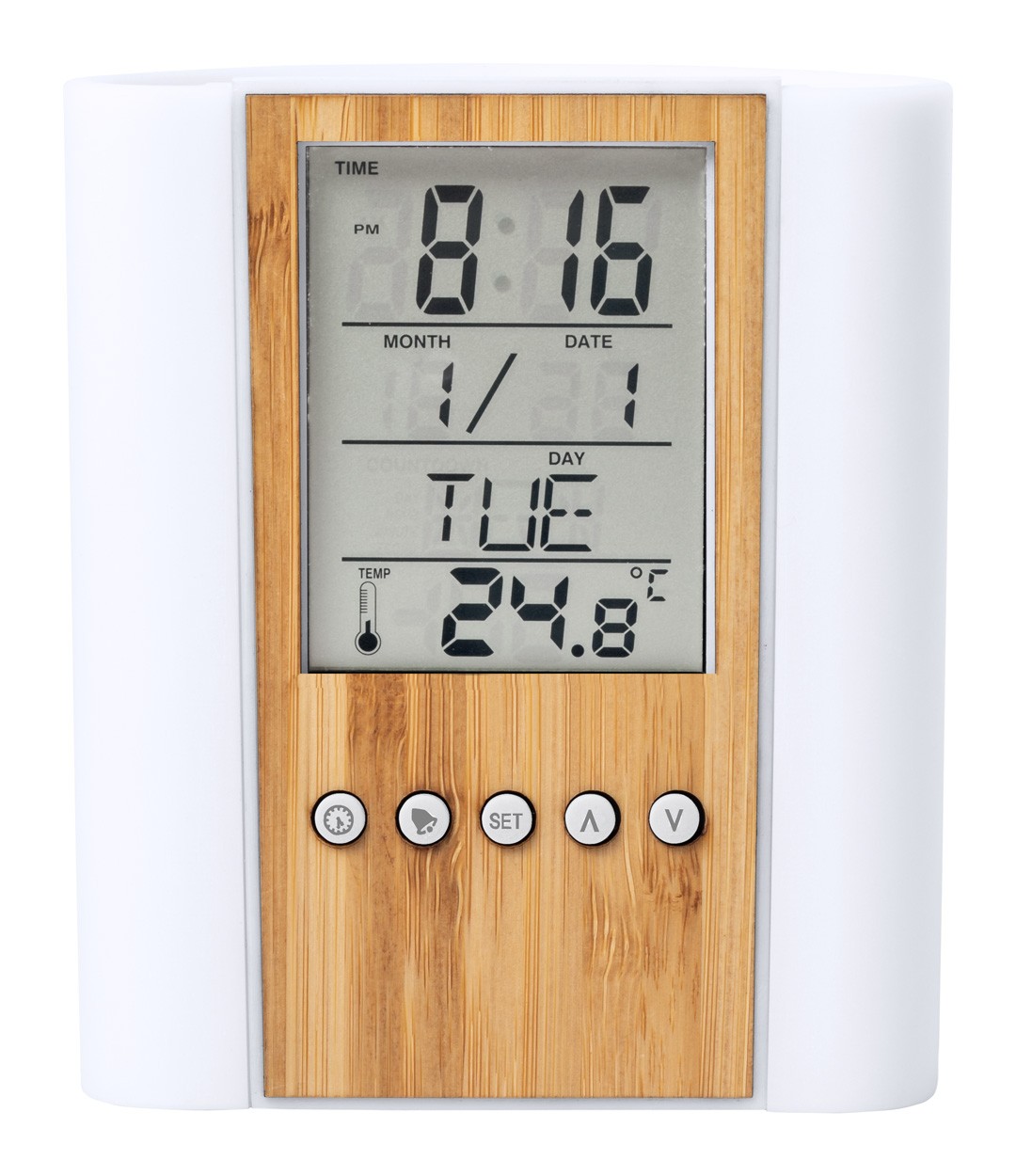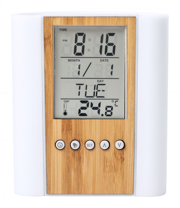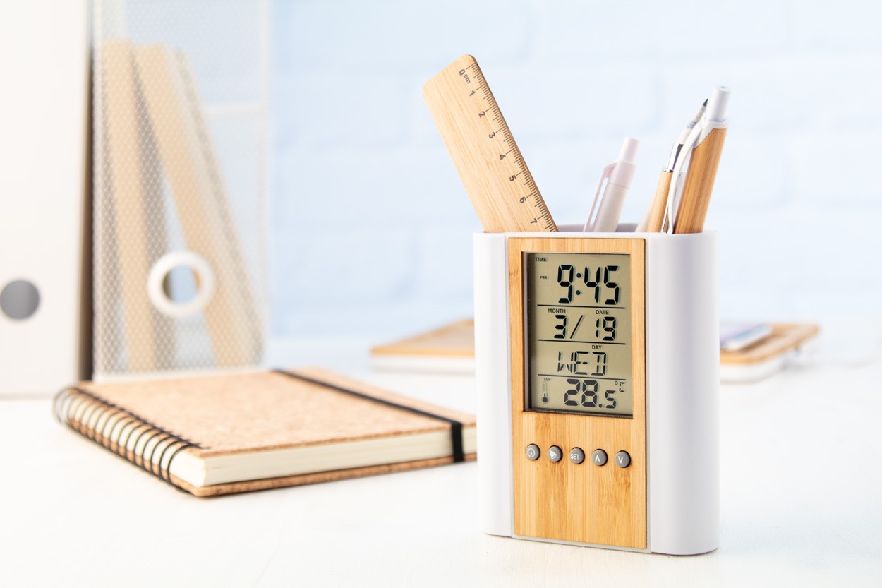 Suport de pixuri multifuncțional din plastic cu front din bambus și display digital. Funcții : termometru, ceas și dată, Cu baterii de ceas