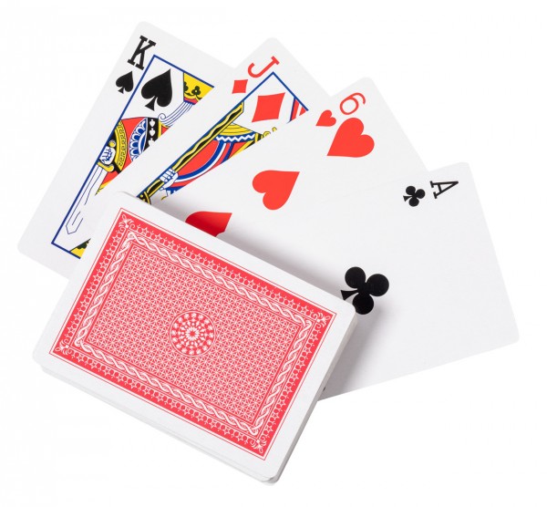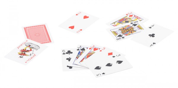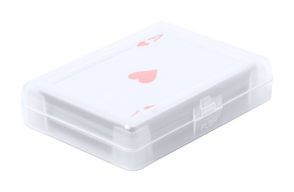 Laminated paper french playing cards in transparent box. One standard deck with 54 cards.