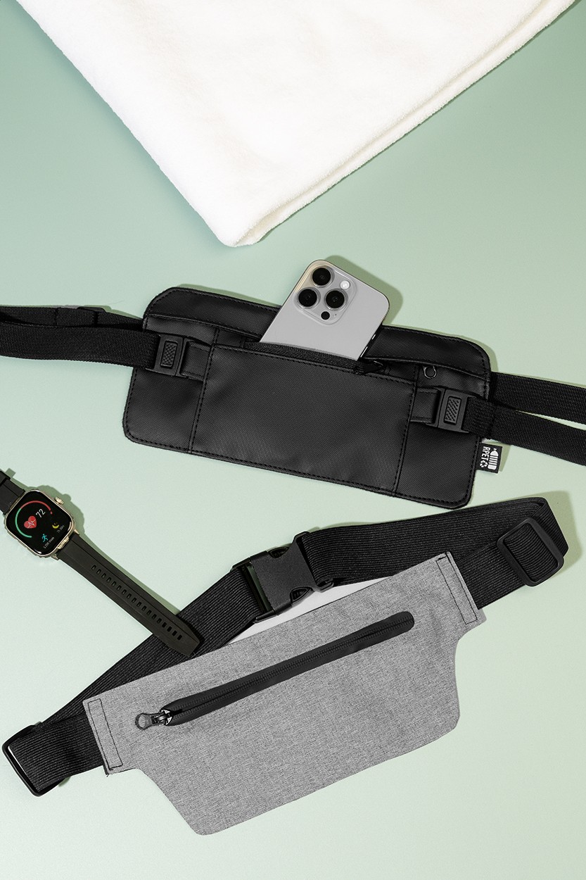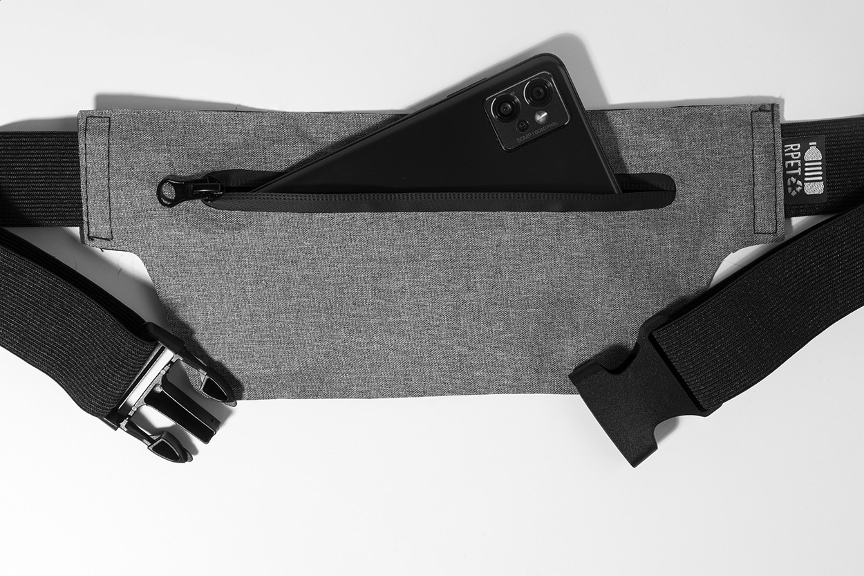 Borsetă slim, din RPET, cu compartiment cu fermoar și curea elastică reglabilă. Poliester RPET 300D, cu etichetă RPET distinctivă.