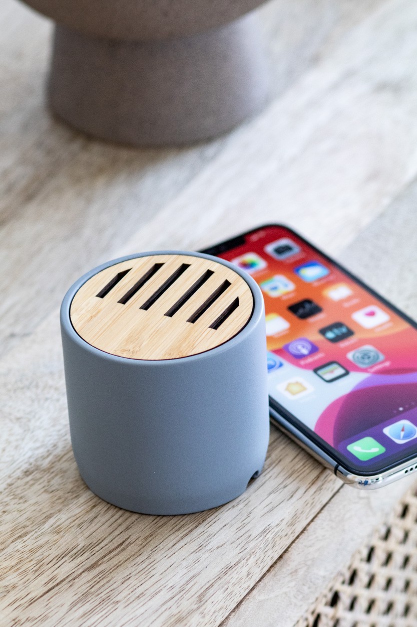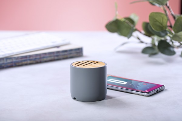 Boxa cu Bluetooth, carcasa din ciment si bambus, cu baterie reincarcabila incorporata. Cablu incarcator USB inclus.