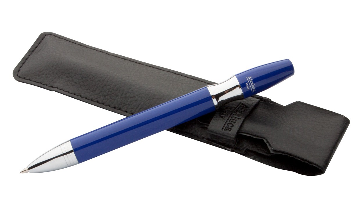 Pix din aluminiu în cutie din înlocuitor piele.Mină albastră. Marca Alexluca.