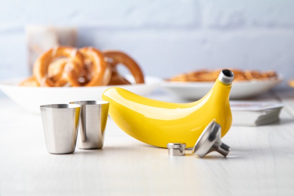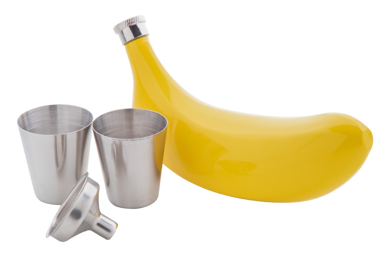 Setul include o sticlă în formă de banană (150 ml), 2 pahare shot și o pâlnie. Din oțel inoxidabil. În cutie neagră de cadou.
