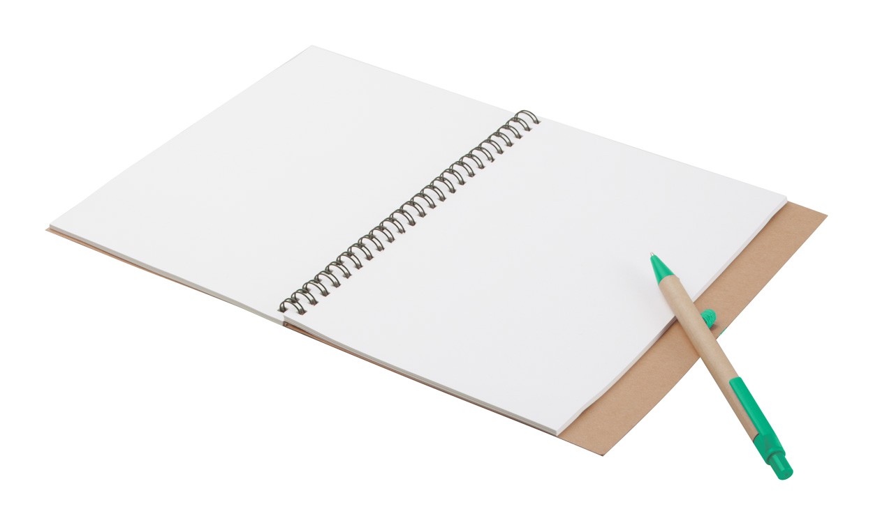 Din hârtie reciclabilă, 60 file veline, cu pix din carton.