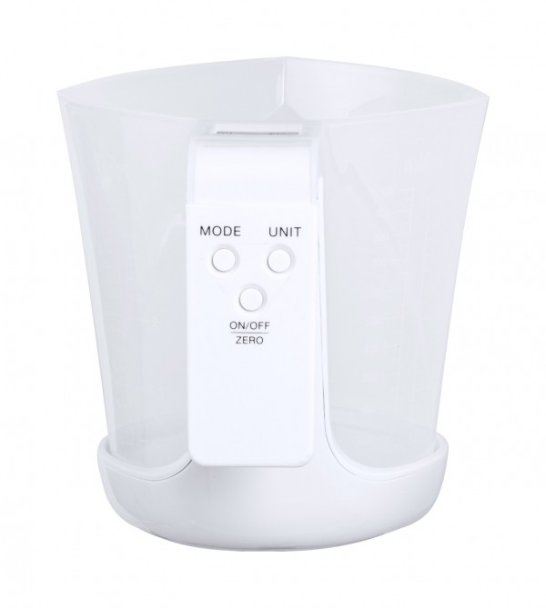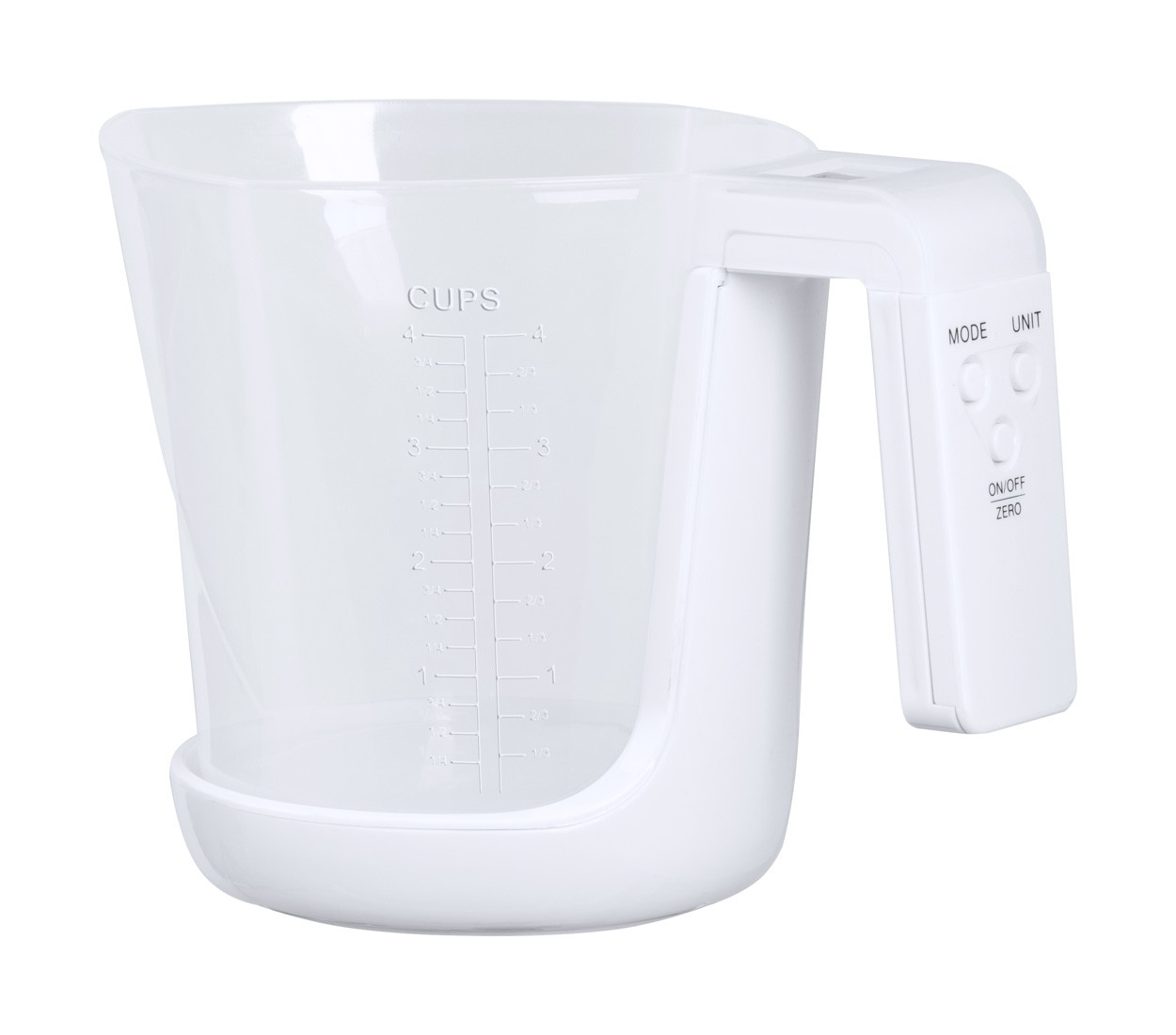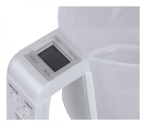 PP and ABS plastic measuring jug with scale, LCD screen and 1 L capacity. Including button cell battery.