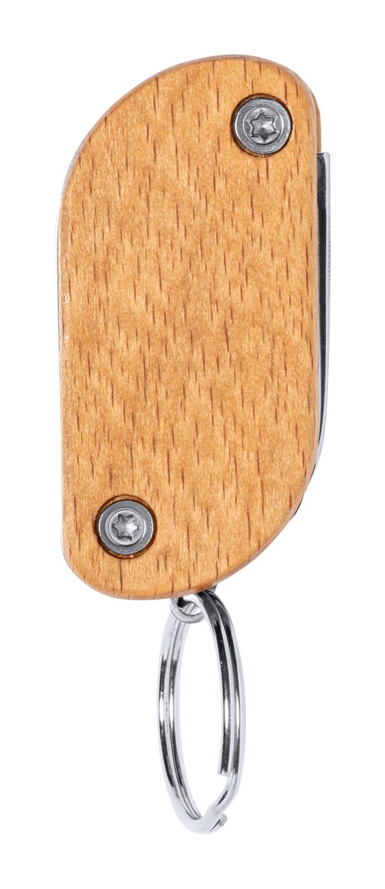 Briceag multifuncțional din oțel inoxidabil, cu carcasă din lemn, 9 funcții. Cu lanternă LED și inel metalic. Cu 3 baterii tip buton.