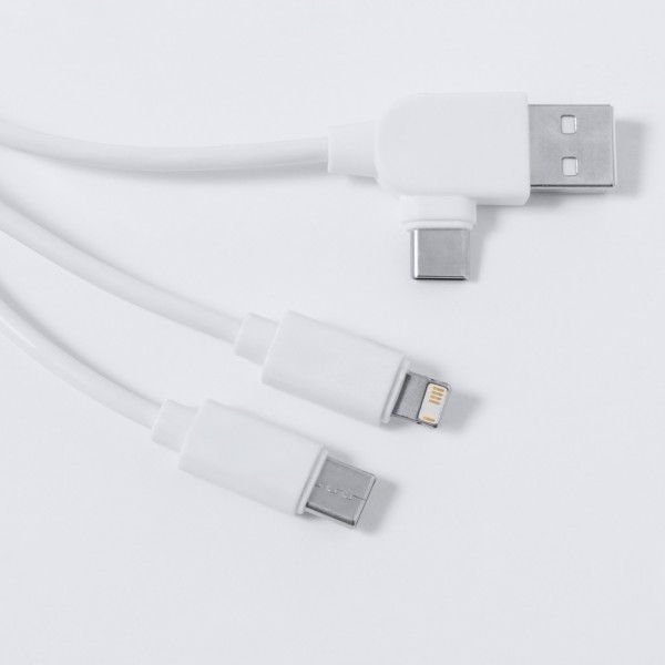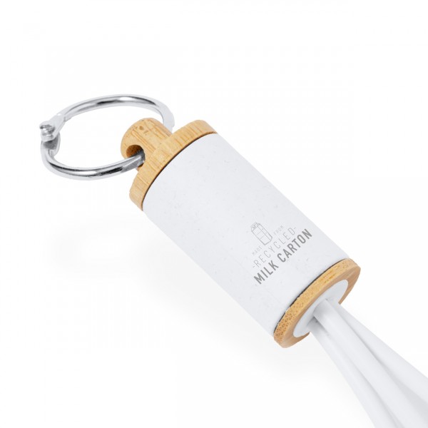 USB charger cable in recycled milk carton and bamboo, with metal keyring. With micro USB, USB-C and Lightning connectors. With USB and USB-C inputs.