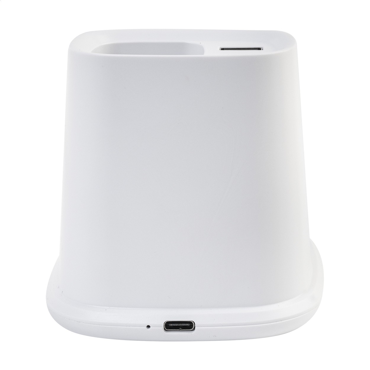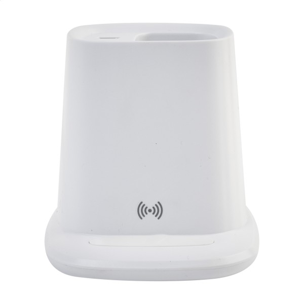 Suport multifuncțional pentru birou, din ABS reciclat, cu suport pentru telefon mobil, încărcător rapid wireless încorporat (10 W), 1 port USB și 1 port USB-C. Include cablu de încărcare USB.