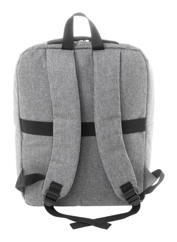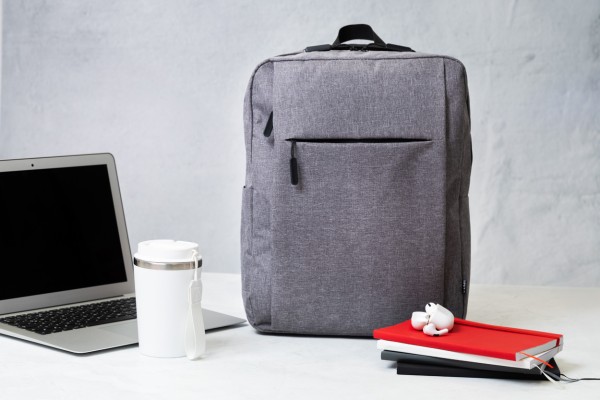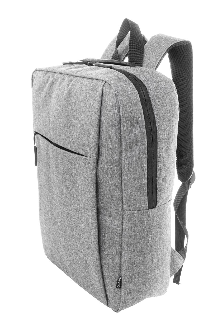 Rucsac RPET, cu compartiment principal cu fermoar, 2 buzunare cu fermoar, buzunar lateral și compartiment căptușit pentru laptop (15"). Cu curea pentru cărucior, spate și curele de umăr căptușite. Poliester 600D RPET, cu etichetă distinctă RPET.