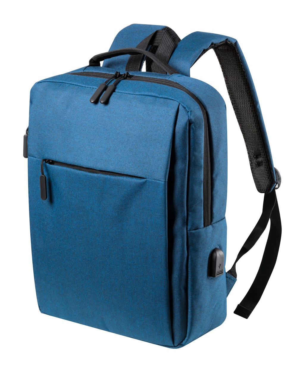 Rucsac cu mai multe compartimente cu fermoar, compartiment cătușit pentru laptop, spate și bretele căptușite. Curea de cărucior și conexiune USB încorporată pentru power bank. Poliester 600D.