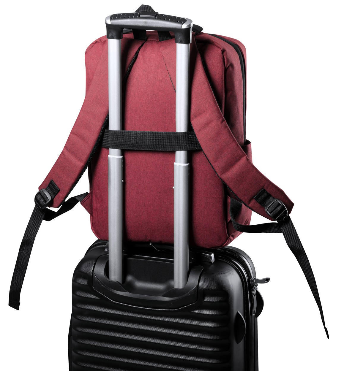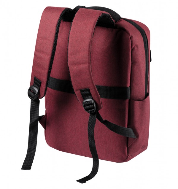 Rucsac cu mai multe compartimente cu fermoar, compartiment cătușit pentru laptop, spate și bretele căptușite. Curea de cărucior și conexiune USB încorporată pentru power bank. Poliester 600D.