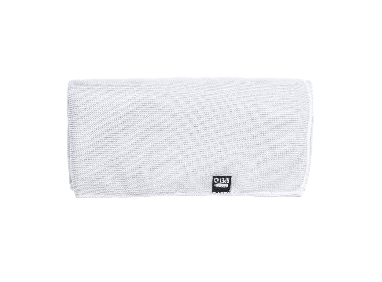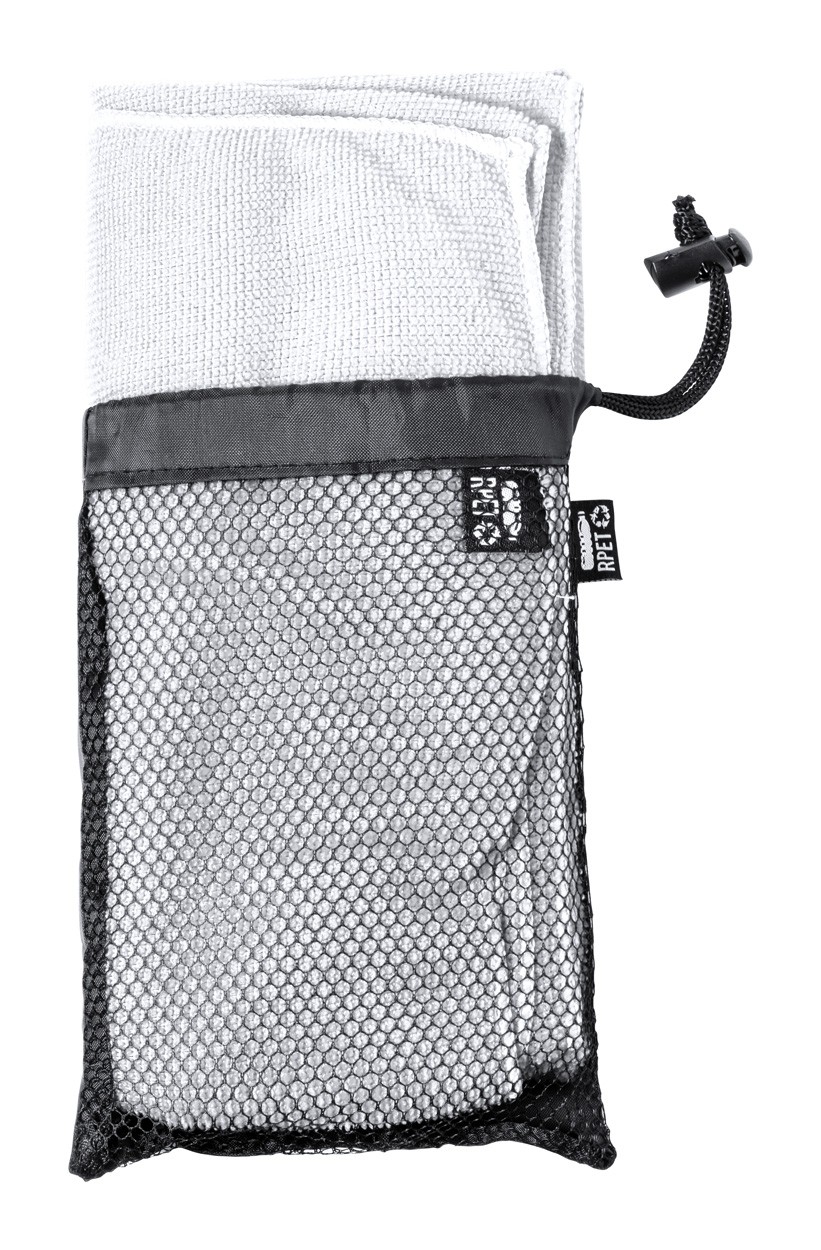 Prosop sport din microfibră în husă de transport RPET cu etichetă RPET distinctă. Poliester RPET, 160 g/m².