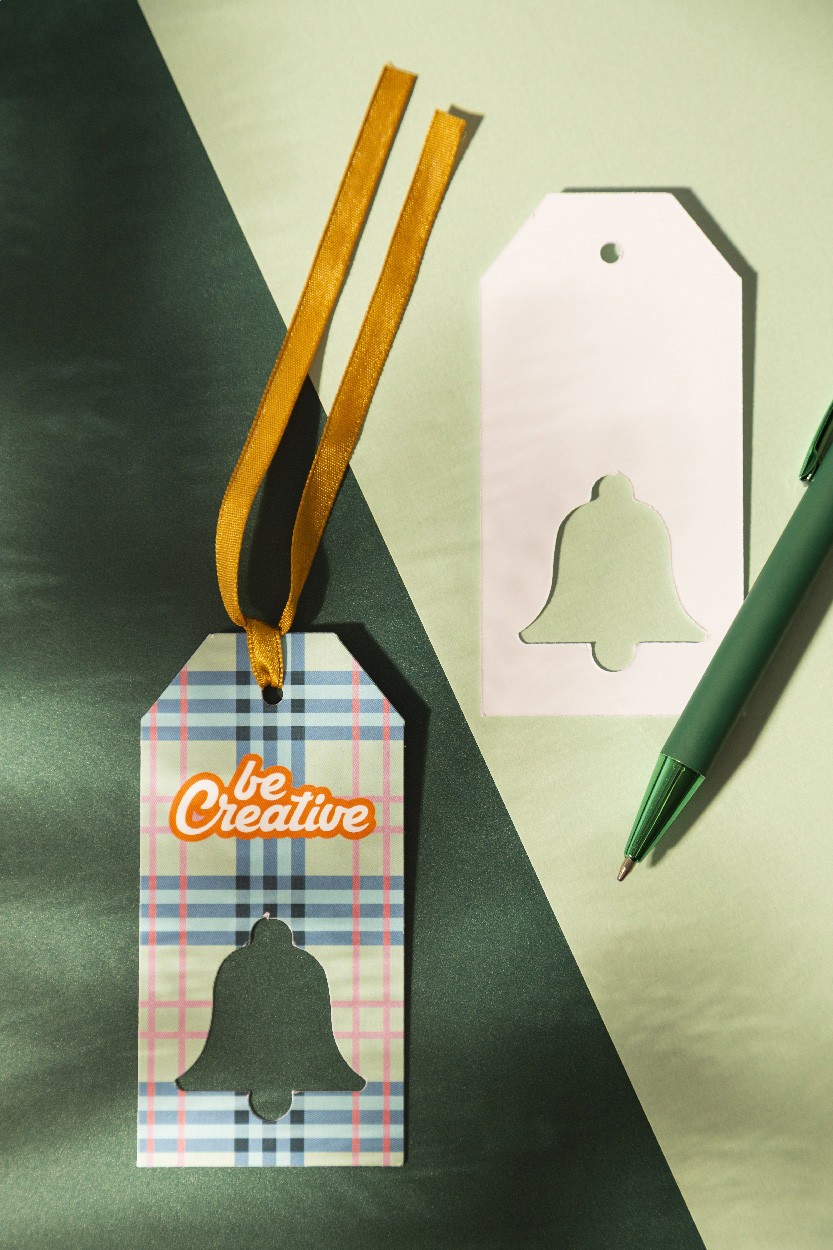 Etichetă pentru cadou, de Crăciun, din hârtie, imprimată color, la comandă, cu motiv de Crăciun decupat și panglică aurie. Prețul include imprimarea digitală pe o singură față. MOQ: 100 buc.