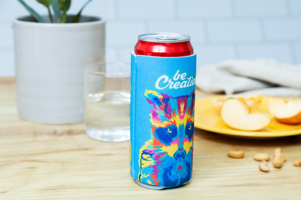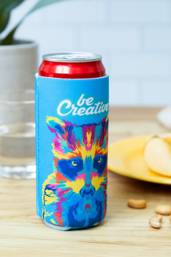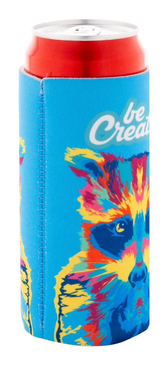 Husă frigorifică din neopren RPET, realizată la comandă, pentru doze de 0,33 L. Cu grafică imprimată prin sublimare. MOQ: 50 buc.