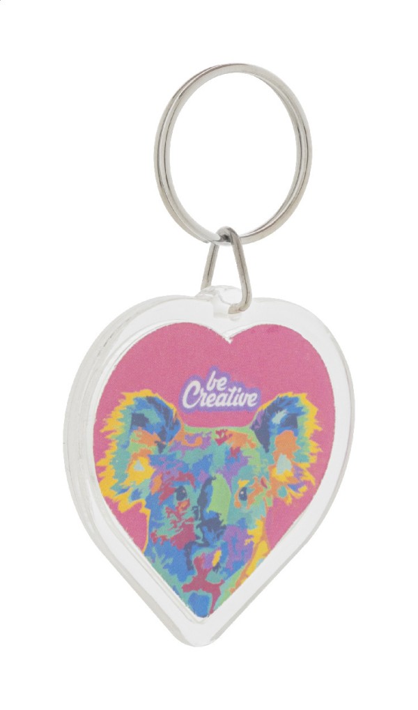 Breloc acrilic în formă de inimă, cu inserție de hârtie personalizată color și inel metalic. Prețul include imprimare digitală pe ambele părți. MOQ: 100 buc.