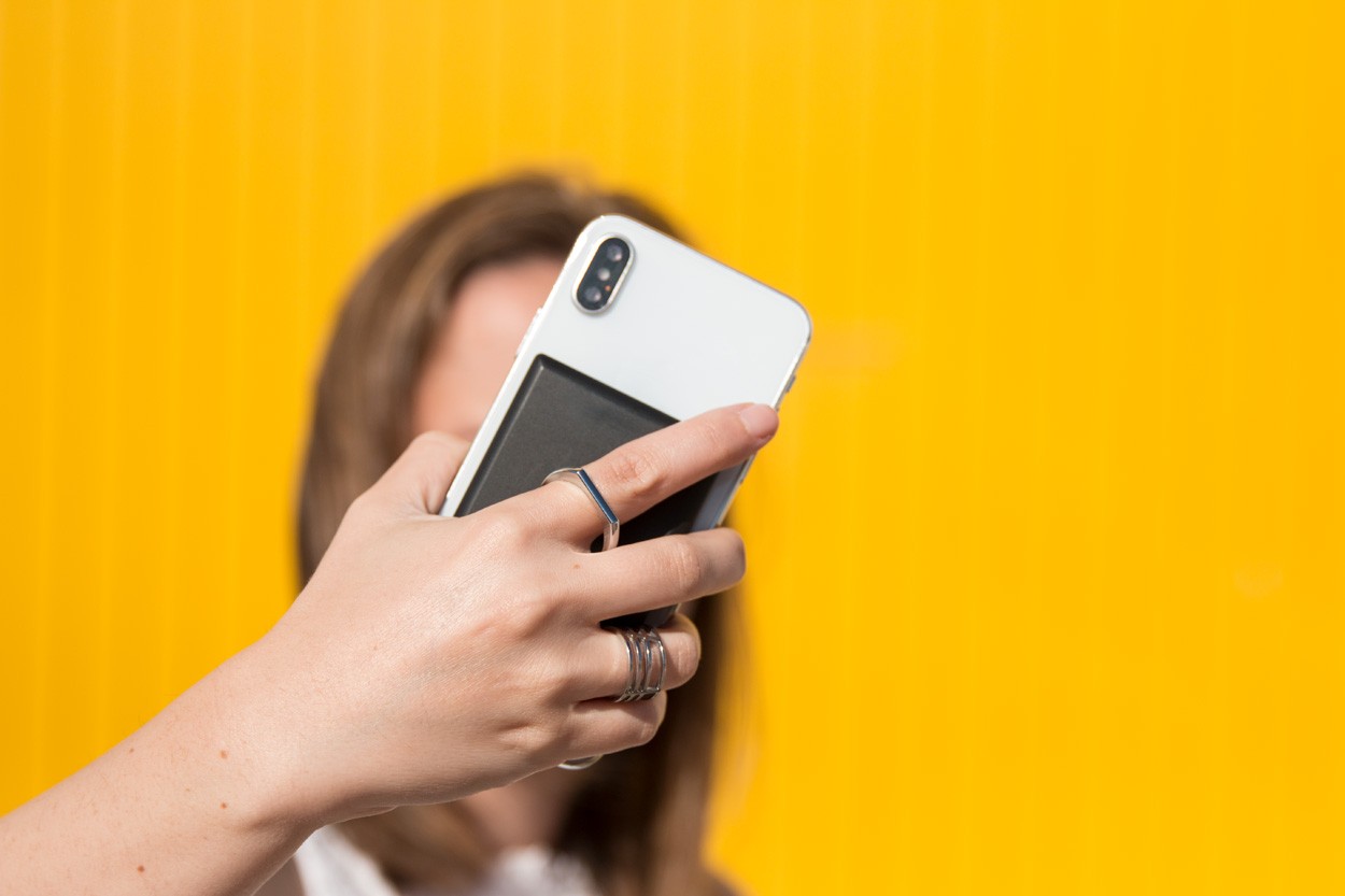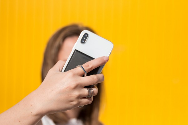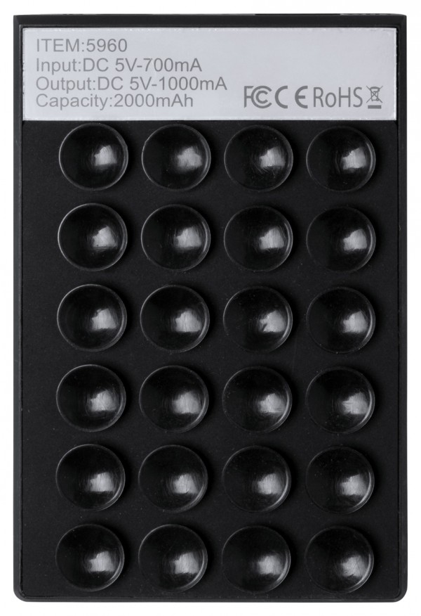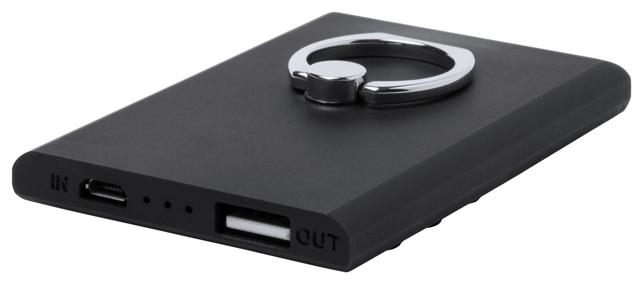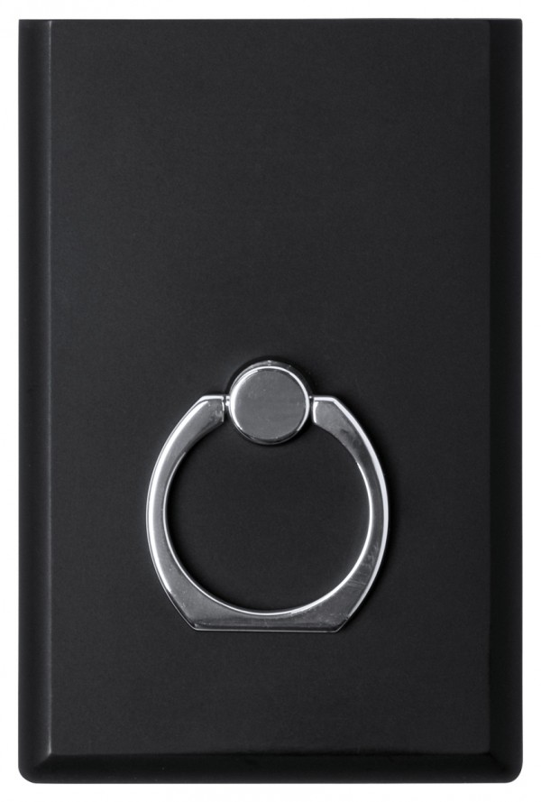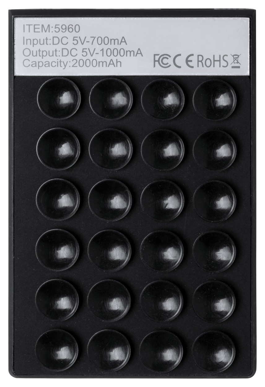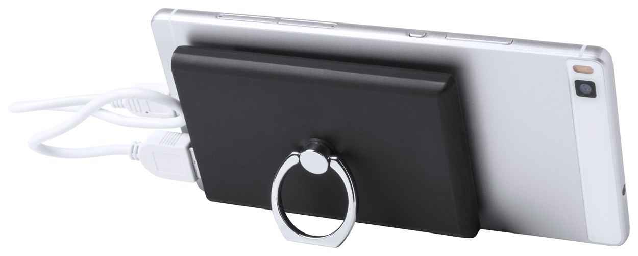 Power bank din plastic în formă de card, cu ventuze, baterie de 2000 mAh, cu suport pentru telefon mobil. Fără cablu de încărcare.