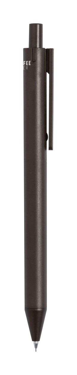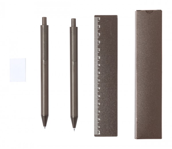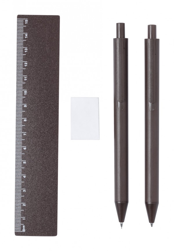Set de birou din plastic din fibre de cafea care include un pix cu mină albastră, un creion mecanic, riglă (15 cm) și radieră. În carcasă din plastic din fibre de cafea.