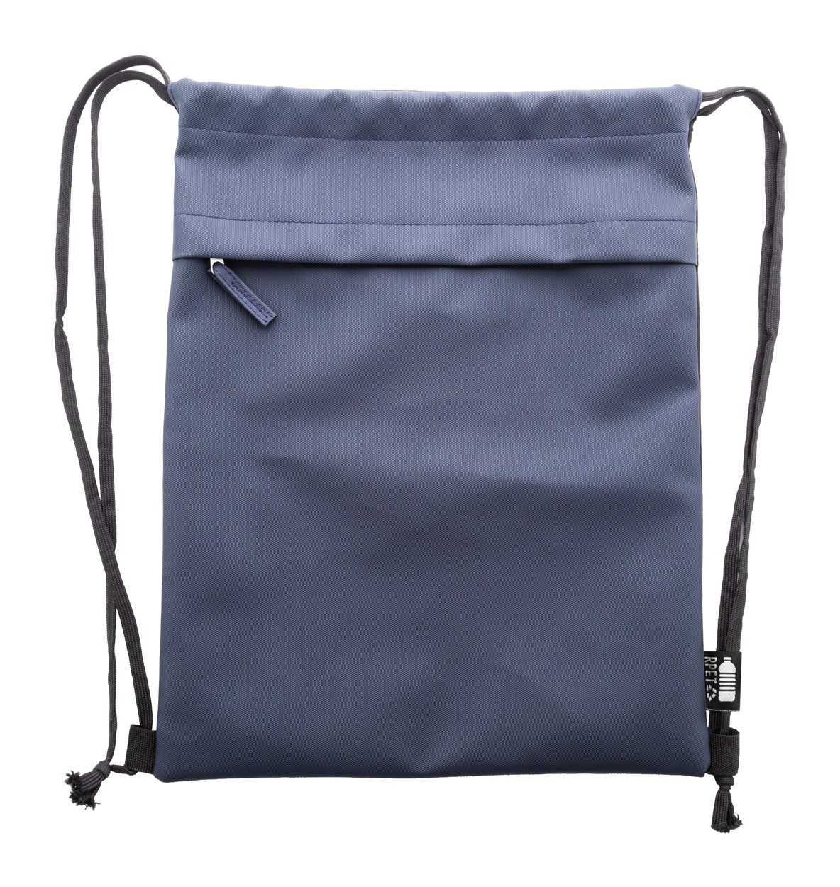 Rucsac RPET cu șnur, cu partea din față acoperită cu PU și buzunar frontal cu fermoar. Poliester 600D RPET acoperit cu PU cu etichetă RPET distinctă.