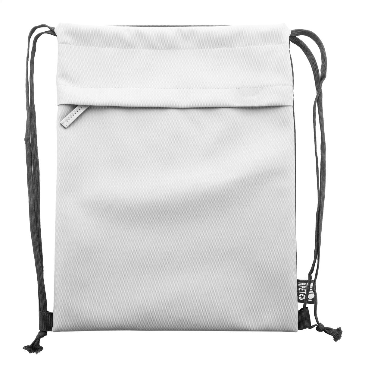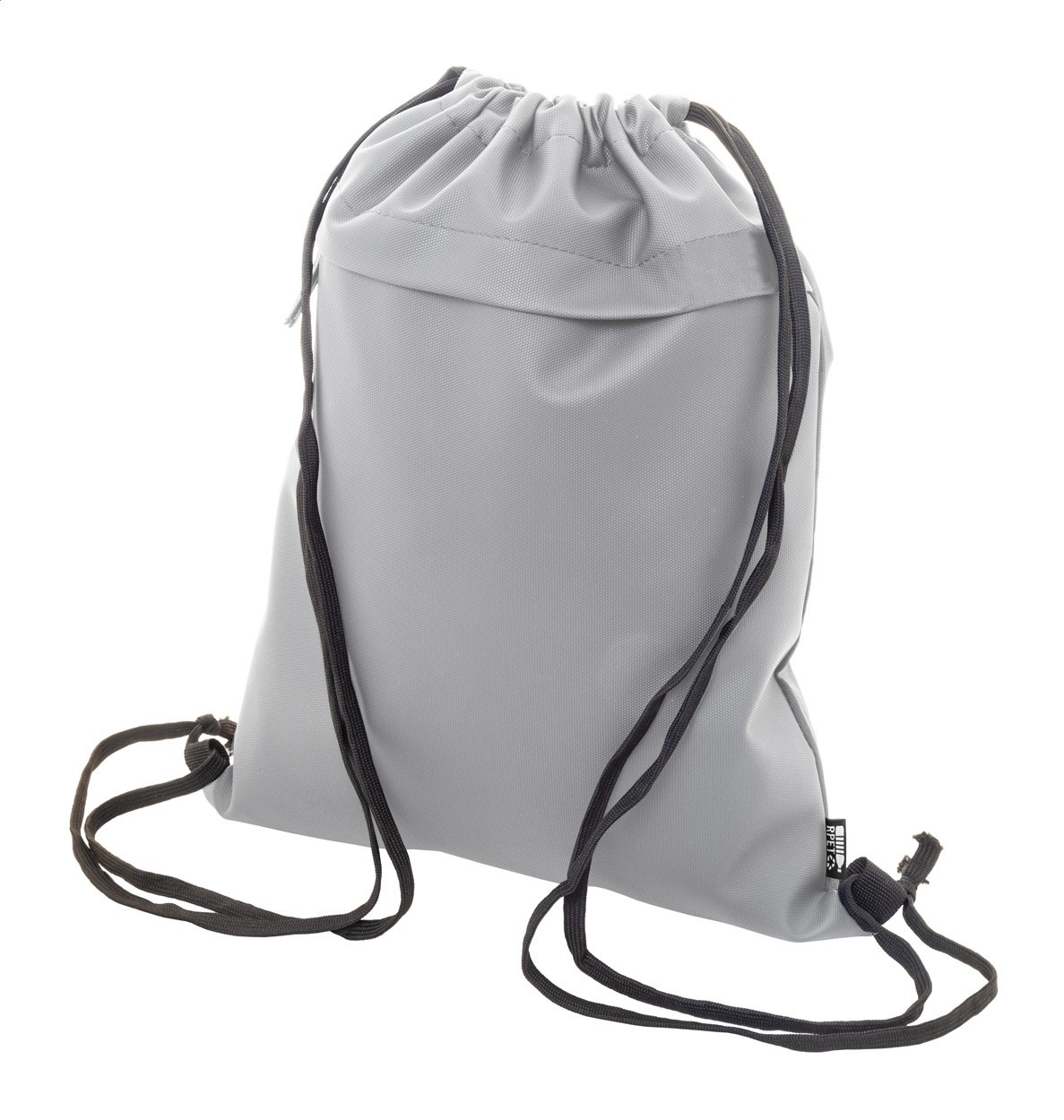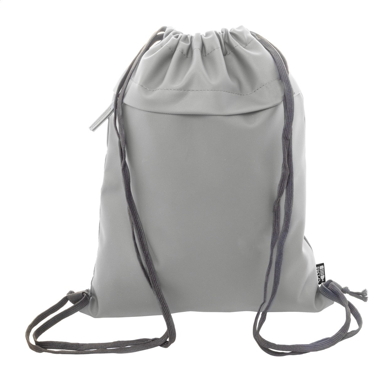 Rucsac RPET cu șnur, cu partea din față acoperită cu PU și buzunar frontal cu fermoar. Poliester 600D RPET acoperit cu PU cu etichetă RPET distinctă.