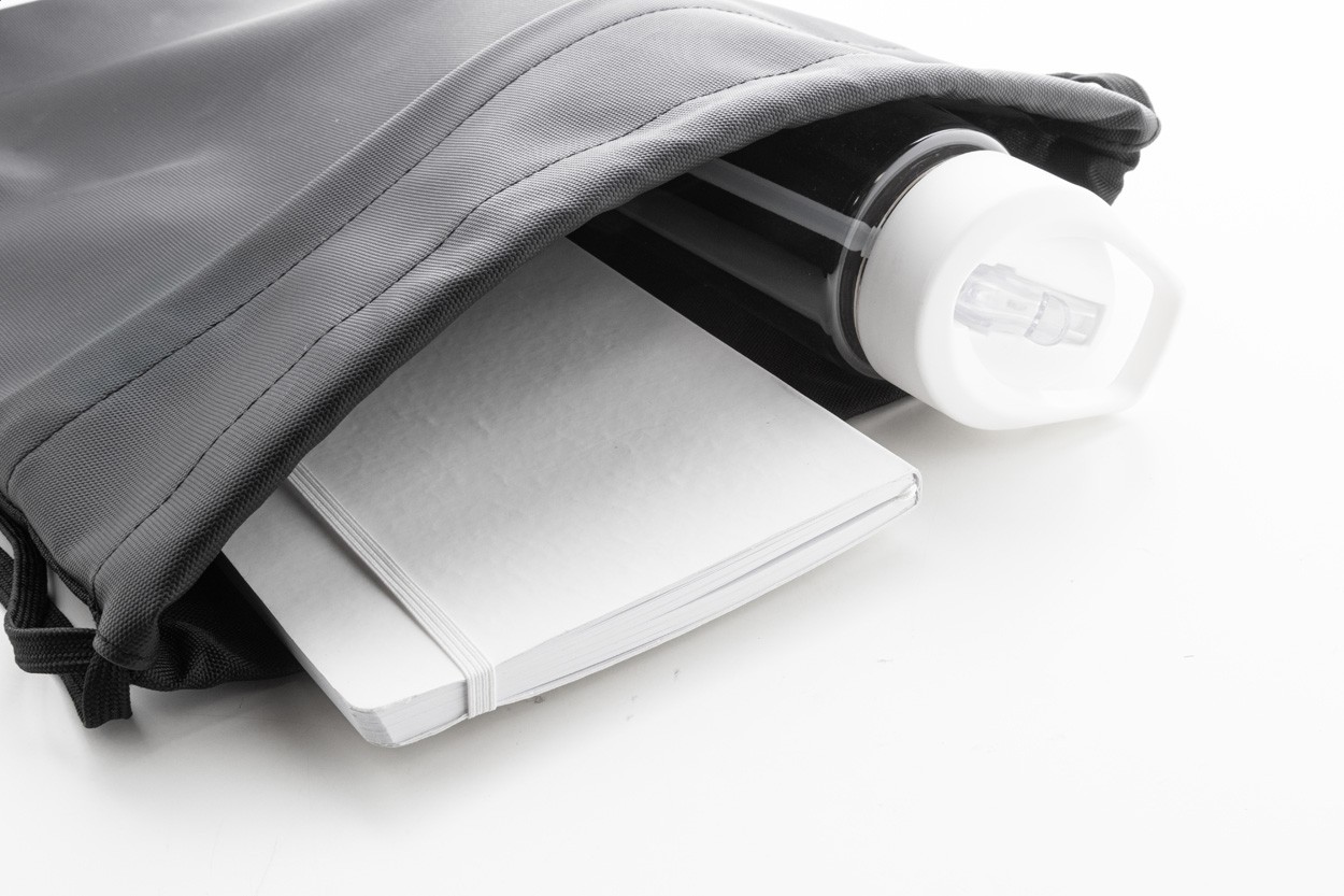 Rucsac RPET cu șnur, cu partea din față acoperită cu PU și buzunar frontal cu fermoar. Poliester 600D RPET acoperit cu PU cu etichetă RPET distinctă.