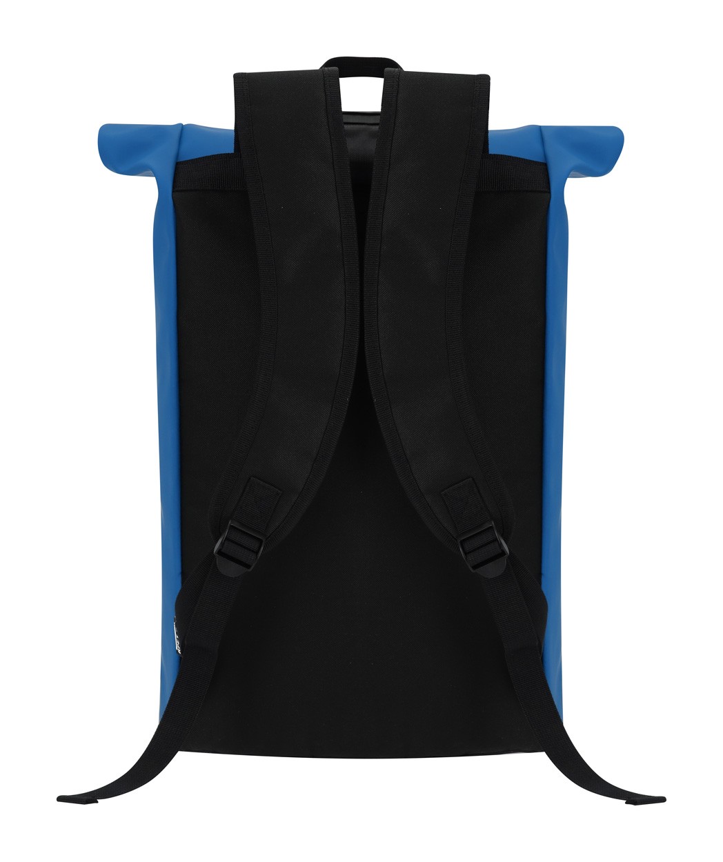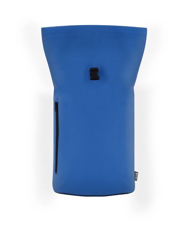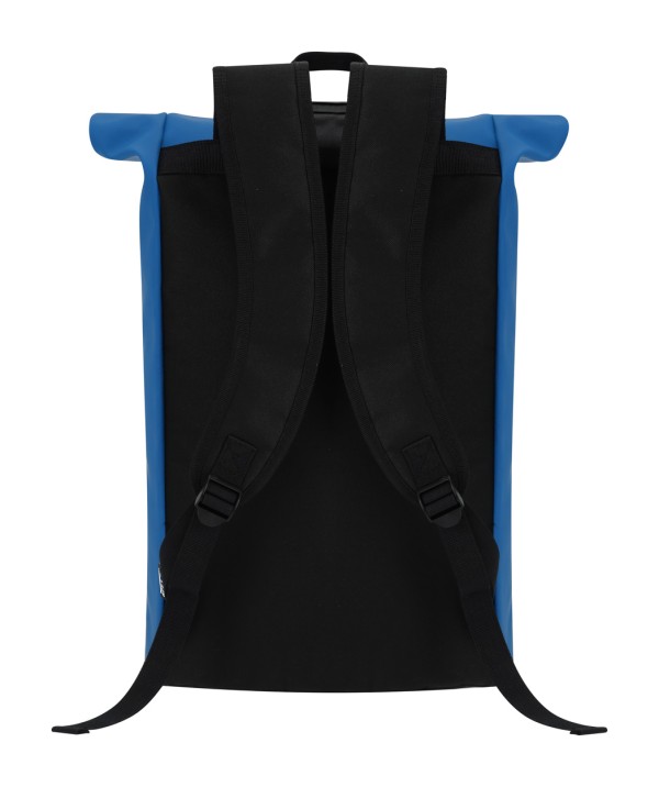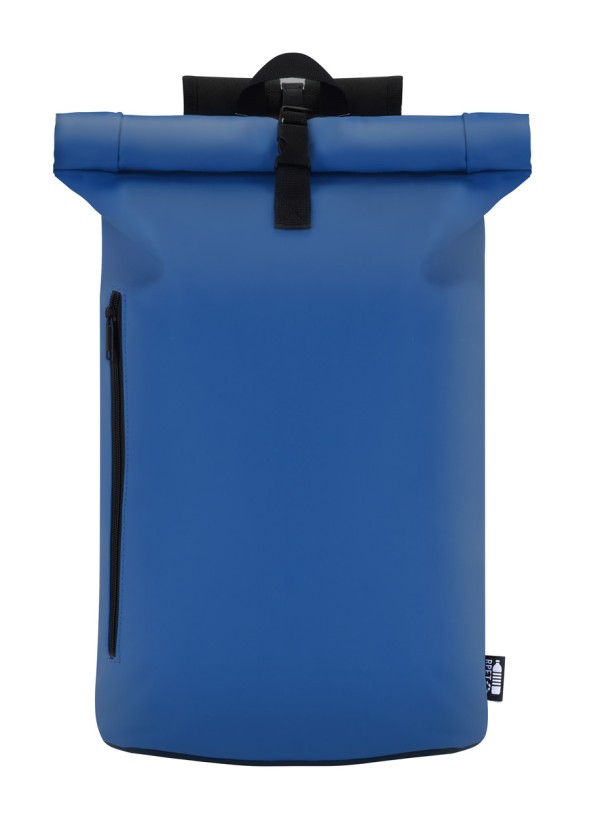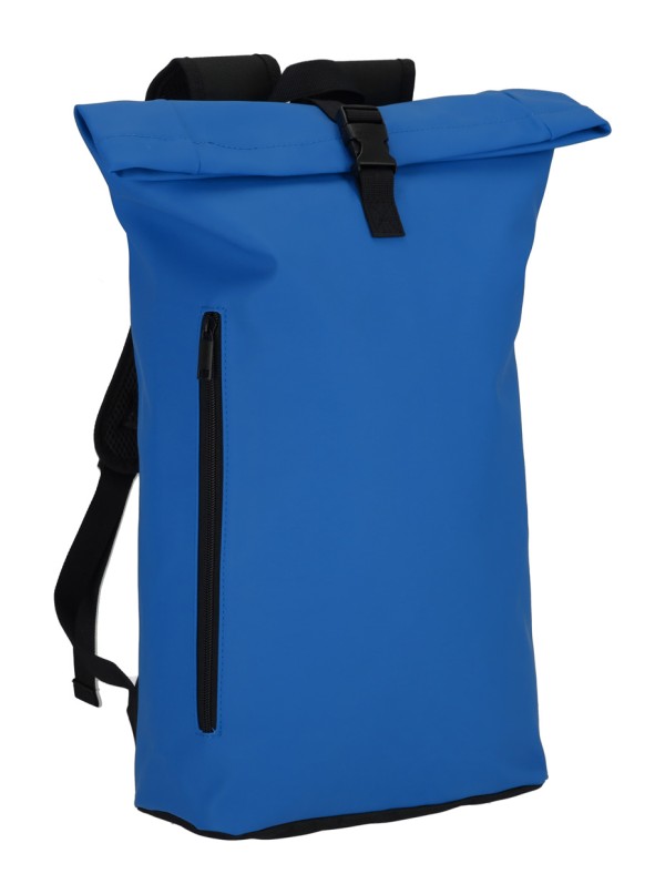 Rucsac rolltop din piele PU moale, reciclată, impermeabil, cu închidere cu cataramă, buzunar frontal cu fermoar și compartiment căptușit pentru laptop (15"). Cu spate și bretele căptușite. Cu etichetă distinctivă din PU reciclată.